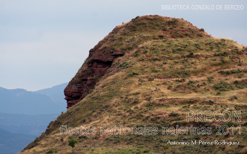 En las fiestas mayores de una ciudad, la verdadera reina de las fiestas, la auténtica protagonista de las fiestas, es la Ciudad —Nájera, en nuestro caso—, y lo es como privilegiado ámbito de convivencia civilizada, como madre y maestra en aquello que hace a sus habitantes más humanos: el fomento de la cultura y las buenas maneras, la urbanidad, el civismo; en definitiva, la ciudadanía. Obligación esencial del pregonero de las fiestas mayores es ayudar a reflexionar a sus conciudadanos, aunque sólo sea durante unos pocos minutos, sobre lo que a todos nosotros nos ha dado y nos sigue dando nuestra muy querida ciudad de Nájera, y, en segundo lugar, lo que, en justa reciprocidad, nosotros debemos hacer por ella. De todo lo que los najerinos le debemos a nuestra ciudad de Nájera, me voy a fijar en lo que mejor conozco y en lo que creo que es lo más importante. Lo más importante que le debemos los najerinos a Nájera es, precisamente, lo que nos hace ser najerinos. Y lo que nos hace ser najerinos es nuestra exclusiva historia común. Por una parte, la memoria de lo que en común hemos vivido en Nájera, no solamente nosotros, sino también las generaciones que nos han precedido. Por otra, la razonable previsión de lo que en común vamos a seguir viviendo y vivirán en el futuro las generaciones que inevitablemente nos van a seguir. Y ser najerino no es ser de cualquier parte. Tenemos los najerinos una historia común grande y fecunda que muchos nos envidiarían, pero que nosotros no hemos hecho mucho por conocerla. Me vais a permitir que a paso apresurado revise algunas de sus zonas peor conocidas.