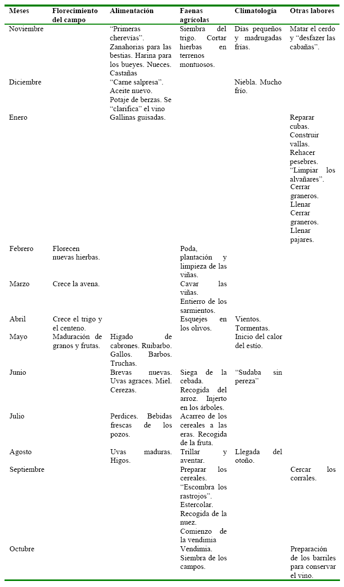 Al final, la gente emplea su dinero en la compra de carne, con lo que don Carnal "cobra quanto ha perdido en los pasados meses" de cuaresma. Otro contraste a la hora de la manutención es el establecido entre la comida de los monasterios, a base de productos de consumo generalmente poco apetecibles, sin consumir carne ni pescado, y la que puede encontrarse extramuros del convento, tal como trata de hacer ver el Arcipreste a doña Garoea, joven novicia por él requebrada. En parecida dirección campesina se encuentra la descripción pormenorizada del calendario agrícola, mes por mes, bajo la alegórica intervención o mediación, según las estaciones del año, de caballeros, hidalgos, ricoshombres y labradores, a través de una visión estamental -tres representantes para cada estación- aún no muy bien aclarada. Veamos lo más característico del tema. Arranca el calendario no el uno de enero a la manera litúrgica acostumbrada, sino según prácticas mozárabes del campesinado, en noviembre. Tres caballeros (noviembre, diciembre y enero) sentados a la mesa, consumen productos de temporada, al tiempo que se ejecutan las faenas del campo en un clima invernal. Y en parecida forma, a la mesa asimismo, se sucederán los distintos meses, agrupados estacionalmente con enumeración de las respectivas tareas campesinas[39]. Todo ello lo podemos esquematizar a través del siguiente cuadro: