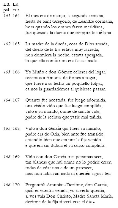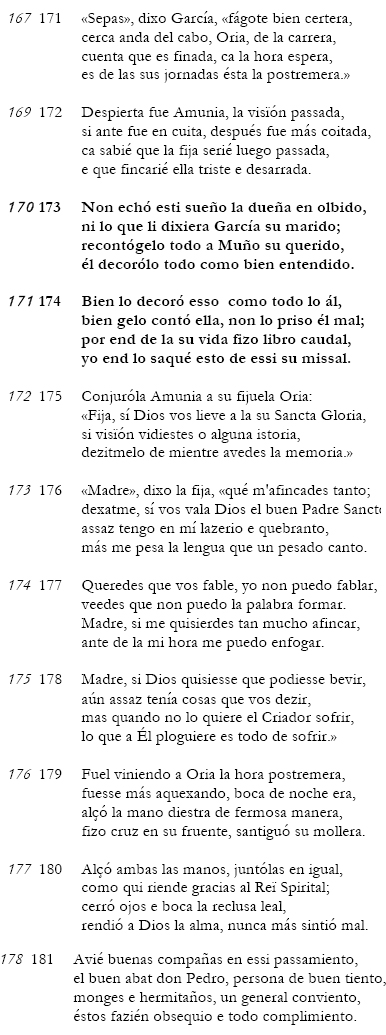 No obstante, cuando Amunia se despierta totalmente afligida, sabiendo que Oria va a morir de un momento a otro, ocurre algo asombroso. En vez de mirar enseguida por su hija moribunda, como sería lo más lógico y humano en un momento así, lo primero que hace Amunia es contarle el sueño a Muño (173c). De hecho, las coplas 173-174 interrumpen de manera inesperada e inoportuna el ritmo precipitado y el extremo dramatismo emocional de la escena, intercalando un paréntesis sobre el tema de la transmisión del relato, que, como sabemos, es oral desde Amunia hacia Muño y escrita (en latín) desde Muño hacia Berceo (174d), un tema que se espera más bien al principio o al final del poema. Desde el punto de vista de la estructura del poema la intercalación del tema de la transmisión del relato en este pasaje parece pues más que dudosa. Volveré más adelante sobre este punto. Detrás de todo hay una intención implícita, pero clara, de hacer resaltar con insistencia la veracidad del relato: