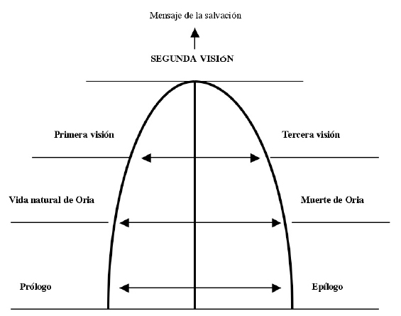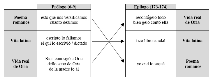 La segunda visión de Oria con la visita de la Virgen María y la promesa de salvación constituye el pivote estructural y el clímax en la vida visionaria y ascética de la santa. Y hay más. Incluso en el interior de esta parte central del poema se reconoce una análoga estructura simétrica que refleja la estructura total del poema. Y lo mismo se observa en la introducción, o sea el episodio sobre la vida natural de Oria (cf. Isabel Uría 1983). El afán de Berceo por crear una simetría estructural parece indiscutible. Como el tema de la veracidad y la transmisión del relato conciernen a la obra en su totalidad y constituyen para una historia visionaria y maravillosa como ésta un aspecto esencial, lo más lógico sería que Berceo lo colocara en posiciones cruciales, al principio del poema, al final o en ambas posiciones a manera de marco que abraza la obra. Recuérdese que cuando Berceo señala la fuente latina como en Signos y en los Milagros, suele situar esta información trascendental al principio del poema o en todo caso al principio del milagro en cuestión. Con argumentos contundentes Isabel Uría (1976, pp. 91-93) demuestra que también es así en el poema que aquí nos ocupa. En su edición reordenada las coplas 6 — 9[17] amonestan al lector a creer lo que se va a contar. Berceo insiste con ahínco en que se trata de una historia verídica avalada por la fuente latina escrita por Muño, quien a su vez tenía las informaciones de primera mano, dado que fue el maestro de Oria y de su madre. Ambas le contaron directamente lo sucedido. Pues bien, entre estas coplas iniciales y las coplas 173-174 aquí comentadas existe a todas luces una estrecha relación, ya que tanto la finalidad como el contenido son prácticamente idénticos. Por eso, y en vista de todos los argumentos anteriores, el lugar que ambas estrofas ocupan en el manuscrito F, o sea al final de la primera visión de Amunia y, por tanto mucho antes de finalizar la historia, no tiene ningún sentido creando no sólo incongruencias contextuales sino también un desequilibrio estructural. En cambio, al final de la obra, en el Epílogo, adonde yo creo que Berceo las tenía destinadas, estas dos coplas forman un perfecto marco temático equilibrado junto con las estrofas del Prólogo y le confieren pleno sentido al sintagma todo lo ál (174a) que hemos comentado arriba. La orientación deíctica es entonces claramente anafórica, refiriéndose a la biografía visionaria que acaba de relatarse mientras que el sintagma paralelo lo ál (9a) al principio del poema denota lo mismo, pero con orientación catafórica. A esto se suma el hecho de que la reconstrucción aquí propuesta restituya un hermoso quiasmo temático que casa perfectamente con la estructura simétrica del poema: