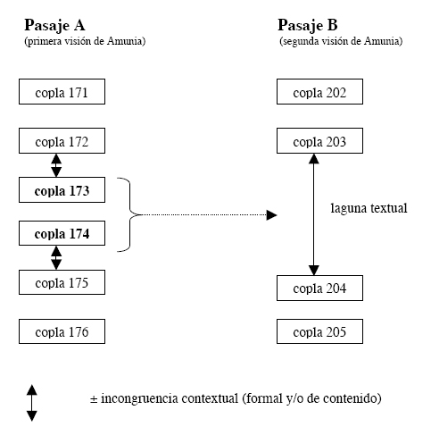 Si suponemos que la copla 173 estaba situada originalmente al final de esta segunda visión de Amunia (pasaje B), a saber detrás de la cuaderna 203, decir que: