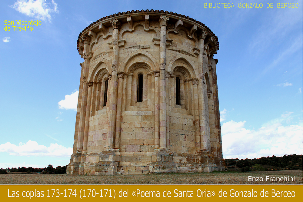Cabe preguntarse finalmente lo que Berceo pretende decir con esso como todo lo ál en el verso 174a. Lo más plausible es que se refiera a la totalidad de la historia, o sea a la biografía ascética y visionaria de santa Oria y a las visiones de Amunia, pero decir esto, según el orden transmitido por el ms. F, justo después de la primera visión de Amunia es sumamente extraño, pues en ese momento todavía faltan acontecimientos esenciales de la historia[16] como la segunda visión de Amunia, en la que Oria revela a instancias de su madre que se encuentra en el cielo entre los mártires, concretamente los Santos Inocentes, una información crucial para el mensaje del poema. Creo que mi propuesta de postponer las coplas 173—174 a la segunda visión de Amunia, o sea al final del poema, resuelve este problema de manera elegante.