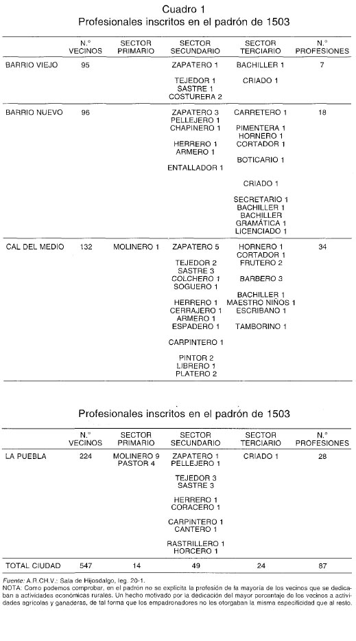 Pero, como ya hemos dicho, en Santo Domingo de la Calzada también se desarrollan desde los siglos plenomedievales trabajos artesanales. A partir del siglo xii documentamos diferentes artesanos, tales como pellejeros,herreros, tundidores, zapateros, sastres, e incluso artesanos que posteriormente no registramos en la Baja Edad Media, como caldereros 58. A finales de la Edad Media, según los padrones de 1503 y 1513 59, podemos comprobar que era el sector textil el que agrupaba al mayor número de artesanos de la ciudad (destacan los sastres y tejedores), debiendo de estar este sector bastante desarrollado, pues como veremos más adelante, también documentamos mercaderes «de facer paños» en la primera mitad del siglo xvi y, además, la renta de los paños conformaba la segunda alcabala más importante en 1495. Al textil le seguían los sectores de la piel (destacan los zapateros, aunque se inscribe también a pellejeros, chapineros y zurradores) y del metal (herrero, cerrajero, armero, coracero, espadero, escudero, campanero). Documentamos igualmente oficios relacionados con la construcción (carpintero, cantero, tapiador, retejador,yesero), con la producción de vino (cubero) y otros de carácter más artístico como relojero, entallador, pintor, dorador, librero, encuadernador o platero 60. En 1503 el mayor número de artesanos se inscribían en la Cal del Medio, a la que seguía en número de profesionales la Puebla y ya a una mayor distancia los barrios Nuevo y Viejo. En el padrón de 1513, sin embargo, el barrio Nuevo superaba a la Puebla.También están presentes en la ciudad profesionales relacionados con el abasto alimenticio, como los molineros, horneros, fruteros, pimenteras, panaderos, tenderos, cortadores y carniceros. Como hemos estudiado en otro lugar, una de las principales líneas de actuación de la política económica del concejo de Santo Domingo de la Calzada, se centraba en garantizar el abasto de productos alimenticios a la ciudad 61. En efecto, el concejo regulaba la provisión de cereal, vino, carne, pan y otros alimentos básicos, y suscribía contratos con panaderos, carniceros, tenderos y taberneros para que la ciudad estuviera bien provista de estos productos. Los mercados y ferias 62, las referencias a mercaderes, y la recaudación de las alcabalas en 1495 y 1509, nos dejan constancia igualmente de los intercambios comerciales que se realizaban en Santo Domingo de la Calzada en los años finales de la Edad Media. Junto a estos vecinos que trabajaban en actividades artesanales y comerciales, distinguimos profesionales relacionados con la salud (médico 63, barbero, boticario, saludador) y otros profesionales liberales como escribanos y letrados (bachilleres y licenciados). También están presentes un bachiller de la gramática y un maestro de niños, responsables de la educación primaria de los niños y de los jóvenes de la ciudad. E igualmente constatamos criados y un tamborino, encargado de tocar el tamboril en los días festivos y señalados. Como en los demás núcleos urbanos de la Corona de Castilla 64, en Santo Domingo de la Calzada nos encontramos con un sector social privilegiado, exento de determinadas contribuciones fiscales, y con otro sector social más numeroso caracterizado por su condición pechera y, por tanto, contribuyente en las imposiciones fiscales directas e indirectas que recaían sobre la ciudad. Desde luego, no se trata de dos sectores sociales homogéneos y, en efecto, dentro de los privilegiados y de los pecheros existían destacables diferencias determinadas por el prestigio social y por la riqueza de sus integrantes. Así, junto a los representantes de la caballería e hidalguía «de solar conocido», distinguimos en Santo Domingo de la Calzada a un grupo más numeroso de hidalgos de privilegio, que tratarán de asimilarse a la pequeña nobleza de linaje a fines de la Edad Media. Mientras, en el sector pechero, las diferencias sociales se ponen claramente de manifiesto entre una reducida élite de familias enriquecidas que acceden al poder, y el resto de pecheros que conforman el común de Santo Domingo de la Calzada.