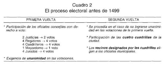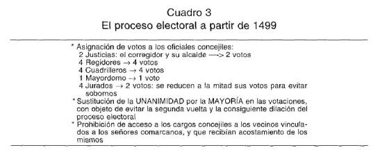 La reforma electoral de 1499, que tal y como se establecía tendría una vigencia de dos años, no siguió el modelo del Capitulado de la ciudad de Vitoria de 1476, a pesar de que se estudió su aplicación 76. Por el contrario se mantuvo básicamente el sistema electivo tradicional, aunque introduciéndose garantías que evitaran presiones sobre los electores a la hora de efectuar la elección. De esta forma se estipulaba el siguiente reparto de votos: los dos oficiales de justicia, los cuatro regidores, los cuatro cuadrilleros y el mayordomo, un voto cada uno, mientras a los cuatro jurados se les asignaban únicamente dos votos «porque son personas baxas y podían ser sobornados» . Pero, además, se establecía que en el caso de que no hubiera unanimidad en las votaciones de los candidatos, serían designados aquellos que contasen con la mayoría de los votos: «y si estando votando en la dicha eleçion no vinieren todos treze votos conformes, valgan el nombramiento de la mayor parte» 77 . Con ello se evitaba una segunda vuelta y la consiguiente participación de las cuadrillas en las votaciones, acabándose por tanto con la dilación en los procesos electorales, así como con las presiones sobre los vecinos designados como electores.