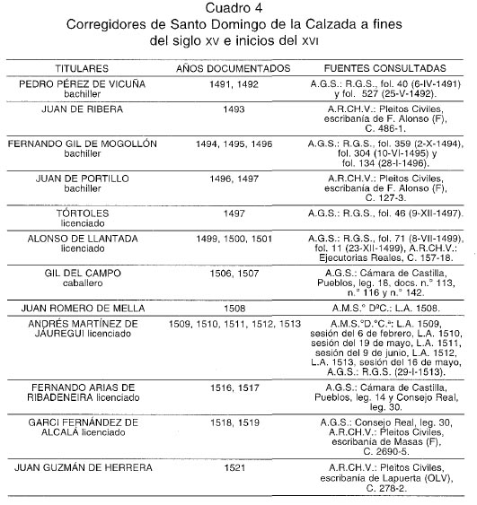 Como hemos podido ir comprobando, la justicia de fuero, es decir, los oficios de justicia elegidos y confirmados por la sociedad política local, tuvo una amplia vigencia en la ciudad calceatense, no consolidándose el régimen de corregidores hasta inicios de la década del los años noventa del siglo xv. Únicamente por estas fechas serán sustituidos los alcaldes ordinarios por un corregidor elegido por el poder real, aunque ya en junio de 1489, los Reyes Católicos habían enviado a Santo Domingo de la Calzada al juez pesquisidor Martín de Villolsola, con objeto de que tomara las «varas de los alcaldes» de la ciudad y pusiera fin a la conflictividad institucional y social existente 78. Dos años después, el 6 de abril de 1491, los Monarcas Católicos concedieron el corregimiento de Santo Domingo de la Calzada por un año al bachiller Pedro Pérez de Vicuña, con jurisdicción civil y criminal, y con capacidad para ejecutar las sentencias, ya que se le autorizaba a apremiar, castigar, proceder contra los culpables y ejecutar la justicia 79. En definitiva, la llegada de los corregidores supondrá el desplazamiento del principal oficio concejil, la alcaldía ordinaria, puesto que el corregidor y su teniente de justicia asumían todas las prerrogativas judiciales y de gobierno de este oficio, durante el período de tiempo que duraba su mandato.