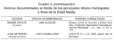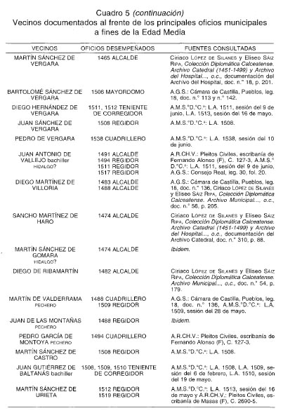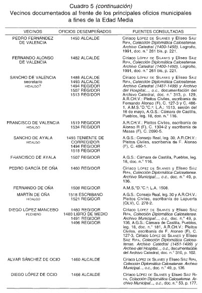 VI. LA ÉLITE GOBERNANTE El análisis de la procedencia social de varios de los detentadores de las principales magistraturas municipales de Santo Domingo de la Calzada a fines de la Edad Media, nos revela una presencia reiterada de determinadas familias e individuos en los regimientos anuales de la ciudad. Un hecho que nos confirma que en los procesos electorales, tanto en los que intervenían los oficiales concejiles como los representantes de las cuadrillas, las alianzas y los mecanismos clientelares entraban en acción, posibilitando la presencia reiterada de determinados miembros de la élite ciudadana en los principales órganos de gobierno. Esta élite social dirigente estaba conformada a finales de la Edad Media por algunos caballeros y un mayor número de hidalgos agrupados en la cofradía de caballeros-hijosdalgo, pero también por pecheros de posición social acomodada cuyo prestigio social y político hundía sus raíces en el período de esplendor del Camino de Santiago 87. Frente a estos «principales», el «común» se encontraba relegado de los regimientos, aunque no por ello se habían cerrado para él todos los cauces de reivindicación política. En efecto, ya hemos visto cómo el concejo mantuvo un carácter abierto a lo largo del siglo xv, e igualmente las cuadrillas, organizaciones comunitarias vecinales, le sirvieron de plataforma para la defensa de sus intereses frente a la élite dirigente. Contamos con algún ejemplo concreto, como cuando el 28 de junio de 1499, y a petición del bachiller de Oña, procurador de las cuadrillas, los Reyes Católicos instaron al corregidor Llantada para que hiciera rendir cuenta de los propios concejiles de los cuatro últimos años. En la disposición también se establecía que en la toma anual de cuentas deberían estar presentes dos personas de cada cuadrilla: «las quales dichas personas asi nonbradas por las dichas quadrillas ayan de estar y estén presentes al tomar y reçebir de las dichas cuentas, pero que non tengan voz nin boto en ellas mas de quanto vean que se toman y reçiben syn fraude nin encubierta, y que si vieren que se faze en las dichas cuentas algund fraude o encubierta que lo puedan reclamar e dezír que se remedie» 88. Todavía a inicios del siglo xvi poseemos testimonios sobre el papel consultivo, de asesoramiento y de control que en determinados temas tenían las cuadrillas 89, así como sobre la presencia en el concejo de «personas diputadas» por la ciudad y por las cuadrillas para tratar diversos asuntos junto a los oficiales concejiles 90. La ausencia de Libros de actas municipales para el siglo xv, supone una limitación importante para abordar el estudio de los representantes de la élite socio-política de Santo Domingo de la Calzada a fines de la Edad Media. No obstante, la recopilación de otros documentos, así como la conservación de algunas Actas municipales en los primeros años del siglo xvi, nos han permitido conocer a algunos de estos vecinos «principales» que participan activamente en los oficios concejiles más importantes e influyentes.