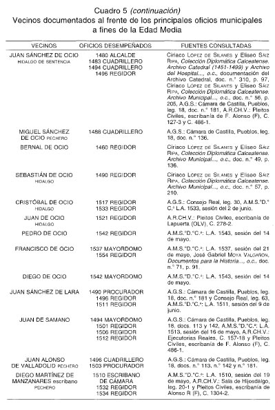 Pero, ¿quiénes accedieron a las nuevas regidurías de Santo Domingo de la Calzada? En 1545 documentamos a los siguientes regidores: Francisco de Ocio, Lope de Ocio, Diego de Ocio, Martín de Ocio, el doctor Amaya, Hernando de Valladolid, Juan de Anguiano, Diego de Villanueva y el bachiller Diego Manso. Podemos identificar entre ellos a varios conocidos miembros de la élite social de la ciudad, pertenecientes a una familia con larga tradición en el gobierno municipal, y dotada de un considerable prestigio social y poderío económico fundamentado en el comercio: los Ocio. Igualmente documentamos a Hernando de Valladolid, que relacionamos con Juan Alonso de Valladolid, vecino pechero que desempeñó cargos concejiles a fines del siglo xv, y también al bachiller Diego Manso, muy posiblemente relacionado con lohan Manso, que fue alcalde a mediados del siglo xiv (concretamente en 1358). Pero, además, también conseguirá obtener una regiduría uno de los miembros de la casa de Leiva. Me refiero al caballero Juan Martínez de Leiva, hermano de Sancho, que como ya sabemos había conseguido avecindarse en la ciudad después de pleitear largamente con el concejo calceatense. La presencia de Juan Martínez de Leiva en las sesiones concejiles no será del agrado del resto de los regidores que, el 8 de octubre de 1545, se negaron a celebrar sesión concejil estando él presente. La posición de los regidores resultaba bastante comprensible, puesto que eran varios los pleitos que mantenía la ciudad con los Leiva, de tal forma que la presencia de uno de los miembros de este linaje en el Regimiento de la ciudad, podía perjudicar los intereses de la misma. No obstante, el corregidor dio la razón a Juan Martínez de Leiva, y amenazó al resto de los regidores con una multa de veinte mil maravedís a cada uno si no celebraban la sesión concejil 131. Posteriormente también obtuvieron regidurías otros miembros de familias de la élite, como Martín Estete, Sebastián Lacayo Ayala, Juan de Samaniego Valderrama, Francisco de Samaniego de Estrada, Francisco de Valencia o Pedro de Ocio Vallejo 132. En definitiva, la supresión del proceso electivo anual de los cargos con poder político, y la consiguiente perpetuación de las regidurías, supondrán una vuelta de tuerca definitiva en la oligarquización del poder político municipal. Se iniciaba así un proceso de patrimonialización de las regidurías 133, que serán privatizadas por un grupo reducido de los miembros más destacados de las familias «principales» de la ciudad, personajes todos ellos que contaban con lazos familiares y clientelares adecuados, así como con la suficiente influencia política y poderío económico como para obtener una regiduría. Ahora bien, ¿perduraron en el tiempo las regidurías perpetuas o se retomó el sistema electivo anual, como sabemos que ocurrió en la vecina ciudad de Logroño en varios períodos de la segunda mitad del siglo xvi y en el siglo xvii? El interrogante deberá ser respondido en una investigación que aborde esta cronología 134.