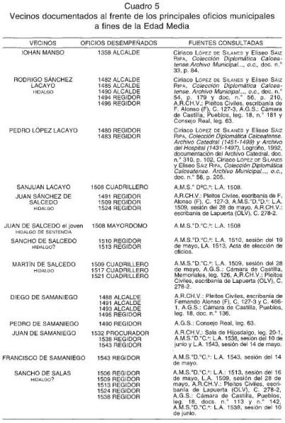 Estos vecinos que accedían a los principales cargos concejiles de Santo Domingo de la Calzada, en general de manera reiterada, como Rodrigo Sánchez Lacayo, Diego de Samaniego, Diego López Mancebo, Sancho de Valencia o Sancho de Salas, pertenecían tanto al sector hidalgo como al sector pechero de la ciudad, aunque a partir del análisis de los oficiales identificados en base a su procedencia social, se aprecia una mayor presencia de los hidalgos en los oficios principales 91. Eso sí, todos los miembros de la élite se caracterizaban por disponer de una posición económica privilegiada en Santo Domingo de la Calzada 92. En efecto, a todos estos vecinos se inscribía en los padrones contribuyendo con la cuantía máxima, y a varios de ellos los encontramos asentando sus firmas con Juan de Arellano, en calidad de escuderos de la ciudad al servicio del rey 93. Varios documentos de la primera mitad del siglo xvi nos proporcionan datos bastante significativos sobre algunos de los miembros de la élite social hidalga. Por ejemplo, en uno de estos documentos se describe de forma suficientemente clarificadora a Juan Sánchez de Salcedo: