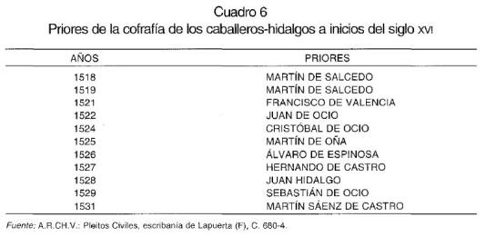 En 1485, el padre de Cristóbal y Juan de Ocio, el también hidalgo (de sentencia) Juan Sánchez de Ocio, había llegado a un acuerdo con la Iglesia para construir un tirador en uno de sus solares y en 1487 sabemos que había acudido a comerciar a Francia, concretamente a la ciudad de Toulouse junto a otro de sus hijos: Sebastián de Ocio Este último, que también hacía gala de su condición hidalga, ejercerá como escribano de número de Santo Domingo de la Calzada a inicios del siglo xvi, será arrendatario de las alcabalas y tercias de la merindad de Logroño en 1510, y en el año 1532 afirmaba que su hacienda «de rraiges e muebles» estaba valorada en unos mil ducados 112. El prestigio social de esta familia de hombres de negocio también se ponía de manifiesto en las elecciones anuales del «Rey de Navidad» y de su séquito, en las que eran elegidos con frecuencia. El cometido de! «Rey» y de su séquito era apear los términos de la ciudad, y la elección se realizaba según «costumbre inmemorial» el 25 de diciembre, recayendo cada año la elección en uno de los barrios de la ciudad. Junto al «Rey de Navidad» se elegía también, como ya hemos dicho, un séquito conformado por dos alcaldes, un alguacil, dos alféreces y un estoque. En el año 1537 la elección recayó en el barrio Nuevo, y el mercader Francisco de Ocio, hijo del también mercader Pedro de Ocio 113, fue elegido «Rey de Navidad», mientras una de las alcaldías recaía en el igualmente miembro de la élite dirigente, Juan de Samaniego, cuya familia era propietaria de una capilla en la catedral m. En 1545 la elección se efectuó en el barrio de la Cal del Medio, recayendo una de las alcaldías en Pedro de Ocio, mientras Sebastián de Ocio fue elegido estoque 115. En definitiva, los Ocio, que participan del ideal caballeresco de la época, pues mantienen armas y caballo y están integrados en la cofradía hidalga, no por ello renuncian a aquellas actividades que les proporcionan riqueza: el comercio y los negocios. Una dualidad caballeros-hombres de negocio, que también observamos en otras ciudades del norte de la Corona de Castilla, tales como Burgos 116 Disponemos igualmente de algunos datos sobre otras familias de la élite como los Valencia. Así, el secretario Sancho de Valencia fue nombrado escribano de sacas del obispado de Calahorra en 1477 por renuncia de su padre Fernando Alonso de Valencia 117, y Francisco de Valencia, prior de la cofradía hidalga en 1521, había sido nombrado Capitán de Santo Domingo de la Calzada un año antes, en 1520 118, y en 1539 fue alcalde de Hermandad 119. Otros miembros de la élite social de la ciudad recibieron igualmente mercedes por parte de la monarquía, como el escribano Juan de Samano, que en 1517 presentaba ante el concejo de la ciudad las cartas y provisiones que certificaban la concesión a su persona del oficio de la escribanía de comisiones de Santo Domingo de la Calzada 120.También fue beneficiado el bachiller Juan Alonso de Vallejo, que obtuvo una provisión real para desempeñar el cargo de letrado asesor del concejo, y que como otros miembros de la élite ciudadana, mandó edificar una capilla en la catedral 121. Estos miembros de la élite social ciudadana serán igualmente arrendatarios de las rentas reales que se recaudaban en la ciudad, concretamente las alcabalas. Así, podemos constatar que en 1495 Pedro de Samaniego tomó en renta al por menor las alcabalas del pescado, caza y madera, trapería y zapatería, por las cuales tuvo que desembolsar una suma que superaba los 100.000 maravedís. Pero, además, también fue arrendatario de las alcabalas de Pazuengos, lugar situado en la merindad de Rioja. En este mismo año, otro de los «principales», el escribano Diego López Mancebo, que había desempeñado el cargo de procurador del concejo en varios pleitos 122, tomó en arriendo la recaudación de la alcabala de la terrería y herradores por 9.820 maravedís 123. También constatamos a ciertos miembros de la élite social, como Martín Sánchez de Urieta, actuado como fiadores en algunos conflictos que protagonizan los arrendatarios de la renta de la carne de la ciudad a inicios del siglo xvi124. Finalmente, la intervención económica de los miembros de la élite social en calidad de fiadores y arrendatarios, también se centró en las rentas concejiles y eclesiásticas. Así, podemos constatar al mercader Francisco de Ocio participando como fiador del arrendatario de la fieldad, una renta que estaba valorada en 10.000 maravedís en el año 1538 125, mientras en 1555, Juan de Ocio, junto a otros cuatro vecinos de la ciudad, tomó en renta la primicia calceatense por 240.000 maravedís 126.