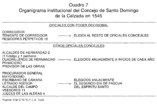 VII. MODIFICACIONES INSTITUCIONALES EN EL TRÁNSITO DE LA EDAD MEDIA A LA MODERNA: LA PERPETUACIÓN DE LAS REGIDURÍAS El sistema de renovación anual de los oficios del Regimiento de Santo Domingo de la Calzada, será modificado hacia mediados del siglo xvi, como también ocurrió en Logroño 127. Las primeras noticias que tenemos sobre los preparativos para introducir regidurías perpetuas en la ciudad calceatense proceden de 1543. El 23 de agosto de este año, el corregidor licenciado Carrillo, enviaba un informe a la autoridad real sobre las posibilidades de crear ocho regidurías perpetuas en la ciudad, haciendo referencia también a las características del organigrama institucional tradicional del concejo calceatense. Afirmaba que el salarlo de los regidores anuales era de setenta maravedís y dos pares de gallinas, y que por cada una de las nuevas regidurías perpetuas se podrían obtener trescientos ducados. El licenciado Carrillo añadía igualmente que había «hablado a muchas personas que me parecía que podían pretender estos oficios» y que aunque «ninguno se a declarado lo que dará ai muchas personas que los pretenderán» 128. Posteriormente, sin embargo, se modificó el número de las ocho regidurías que se pretendían crear, puesto que en la sesión de concejo del 1 de diciembre de 1544, se hacía referencia a que «su alteza» ha ordenado «criar» diez regidores en Santo Domingo de la Calzada 129. Unos regidores que ya ejercían sus funciones en la ciudad por lo menos a inicios de 1545, y que alterarán el organigrama institucional concejil de la ciudad. En efecto, la aparición de las regidurías perpetuas significará la desaparición de los oficios de cuadrilleros y jurados, quedando el esquema de oficios concejiles tal y como se expone en el cuadro 7. El poder efectivo de la ciudad recaerá, por tanto, en el corregidor, su teniente y en los regidores, que son los que cuentan con derecho a voto para elegir al resto de los oficiales del concejo. Los regidores serán los que se encarguen especialmente de todo el trabajo político concerniente al «buen gobierno» de la ciudad calceatense, y para repartirse el trabajo y hacerlo por tanto más efectivo, el 1 de marzo de 1547 se crearon comisiones de dos regidores para ocuparse por turnos y semanalmente de todos los aspectos relativos al gobierno municipal130