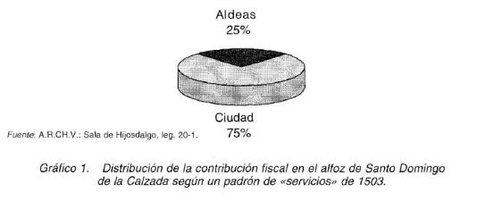 A lo largo de la Baja Edad Media los linajes de la alta nobleza con intereses en el territorio riojano, especialmente los Estúñiga, Manrique, Velasco y Arellano, trataron de extender su influencia a los núcleos urbanos. De esta forma, a finales del siglo xiv Navarrete, Haro y Briones se integraron bajo dominios señoriales y, ya en la segunda mitad del siglo xv, ocurrirá lo mismo con Nájera 14. Por el contrario, Logroño y Santo Domingo de la Calzada conseguirán mantenerse dentro de la jurisdicción realenga, aunque ello no las librará de sufrir constantes presiones e injerencias por parte de la nobleza. No debemos olvidar, por ejemplo, el importante grado de influencia que tuvo el conde de Aguilar en el gobierno de la ciudad de Logroño en los años finales de la centuria del cuatrocientos 15. La defensa y el control de sus jurisdicciones supondrán, por tanto, para los gobiernos urbanos de los núcleos urbanos altorriojanos, una frecuente fuente de conflictos con los señoríos nobiliarios comarcanos. El incremento de los alfoces urbanos había presentado, en este sentido, importantes problemas por la propia disgregación jurisdiccional de la comarca. No obstante, la ciudad de Santo Domingo de la Calzada trató de extender su ámbito territorial mediante la compra de términos y aldeas, pues como se quejaban reiteradamente los miembros de su concejo, «la dicha çibdad non avia sino muy pequennos términos» 16. De esta forma, el concejo ciudadano adquirirá «derechos y pertenencias» a particulares en varias aldeas de sus alrededores 17, y en 1352 se hará con el señorío de Ayuela, traspasado por el monasterio de Santa María de Cañas a cambio del pago de un censo anual de mil quinientos maravedís 18. En este proceso expansivo el concejo calceatense logrará incorporar a su alfoz a las aldeas de Manzanares y Gallinero, aunque en otros casos seguirá compartiendo derechos con otras instancias de poder, como ocurría en las aldeas de Pino de Yuso y Pino de Suso19. Esta situación daba lugar a frecuentes debates motivados por la defensa de una jurisdicción señorial, que no siempre estaba muy clara. Así, el concejo calceatense afirmaba que la aldea de Grañón había sido incorporada a su alfoz por merced de Alfonso X en 1256, ostentando privilegio 20, pero poco después debió perder el señorío, pues a fines del siglo xiv Diego López de Estúñiga mostraba sendos privilegios de confirmación real de la merced que se le había hecho de la aldea de Grañón en 1384 21. Todavía a inicios del siglo xvi, concretamente en 1534, Santo Domingo de la Calzada y los duques de Béjar pleiteaban por el señorío sobre Grañón, negando el procurador de los Duques la autenticidad del privilegio de merced presentado por el concejo de la ciudad 22. Algo similar sucedía con la aldea de Villalobar, que el concejo de Santo Domingo de la Calzada defendía haber comprado a Sancha Ruiz de Rojas, mostrando para ello un privilegio de confirmación del monarca Juan I, fechado el 6 de diciembre de 1380 23. Pese a ello, el señor Juan de Leiva no debía encontrarse muy de acuerdo con el señorío de la ciudad sobre la aldea, de tal forma que unos días después de la confirmación, concretamente el 11 de diciembre, había entrado por la fuerza en Villalobar, vertiendo amenazas de muerte contra de los vecinos de Santo Domingo de la Calzada 24. En definitiva, podemos comprobar que resulta complicado determinar la evolución de la conformación del alfoz de la ciudad en los siglos bajo-medievales, puesto que como hemos visto, los derechos señoriales adquiridos no siempre estaban claros. Así, Manzanares, aldea sobre la que el concejo de Santo Domingo de la Calzada había ejercido un dominio marcadamente señorial en muchos aspectos25, también fue ambicionada por la nobleza comarcana. Concretamente, hacia 1491 sabemos que la aldea se había comprometido a pagar al alcaide de Bañares, Pedro Ruiz de Ahumada, un censo anual de veinticuatro fanegas de trigo, intentando sustraerse de esta manera de la jurisdicción de Santo Domingo de la Calzada26. El concejo ciudadano reaccionó inmediatamente afirmando corresponderle la jurisdicción sobre la aldea, cuyo alcalde, que podía librar pleitos de una cuantía de hasta sesenta maravedís, siempre había sido elegido por las autoridades concejiles calceatenses27. La insistencia de Santo Domingo de la Calzada en la defensa de sus derechos jurisdiccionales sobre Manzanares, posibilitó que en 1492 los Monarcas Católicos prohibiesen a los vecinos aldeanos tomar encomendero con objeto de sustraerse de su jurisdicción, aunque esto tampoco supondrá un freno a las presiones nobiliarias28. De acuerdo con un padrón municipal de 1503, podemos constatar que eran cuatro las aldeas que se inscribían en este recuento vecinal de carácter fiscal como pertenecientes al alfoz de la ciudad: Manzanares, Gallinero, Corporales y Villalobar29, siendo elegidos los jueces de las mismas por el concejo de Santo Domingo de la Calzada 30. Como podemos comprobar en el gráfico adjunto, el peso de la contribución fiscal en el conjunto de la ciudad y aldeas, recaía fundamentalmente en el núcleo urbano, donde se concentraba el mayor porcentaje de efectivos humanos de la jurisdicción.