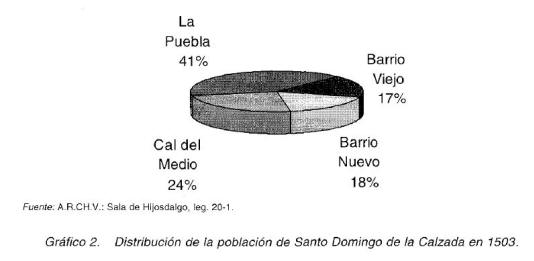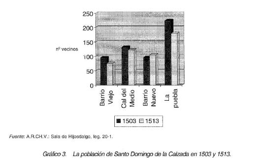 Los efectos de la «pestilencia» se acrecentaron, además, por la actitud del bachiller Velasco de Medina, alcalde teniente del corregidor Gil del Campo, y de otros vecinos que permanecieron en la ciudad, los cuales trataron de impedir que algunas familias salieran de Santo Domingo de la Calzada, llegando incluso a cerrar todas las puertas y poner guardas en las mismas52. A través de un padrón de 1513 podemos comprobar que el vecindario de la ciudad todavía no se había recuperado de los efectos de la epidemia y, así, la población de Santo Domingo de la Calzada pasó de los quinientos cuarenta y siete vecinos que se inscribían en el padrón de «servicios» de 1503, a los cuatrocientos ochenta y dos vecinos inscritos en 1513, decreciendo los efectivos humanos en todos los barrios, excepto en el barrio Nuevo.