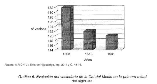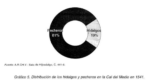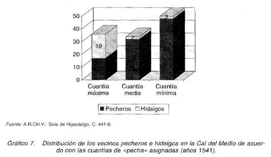 Un padrón fiscal del año 1541 nos ha permitido conocer con bastante detalle la distribución social en uno de los barrios de la ciudad, concretamente en la Cal del Medio. El padrón fue confeccionado con objeto de recaudar doscientos ducados necesarios para pagar las deudas que tenía contraídas la ciudad con los letrados y escribanos de la Audiencia Real de Valladolid. De acuerdo con este documento son ciento veinte vecinos los que se inscriben en el barrio, con lo que podemos comprobar que la población del mismo ha descendido respecto a los años 1503 y 1513. En cuanto a la procedencia social, noventa y siete vecinos son pecheros, frente a veintitrés hidalgos que también contribuyen en este repartimiento. Entre estos últimos únicamente se empadronan un caballero (Sancho Martínez de Leiva) y dos hidalgos notorios (Juan de Rosales y Juan de Rudiez), siendo catorce los hidalgos de sentencia. Los restantes se identifican de la siguiente manera: dos mujeres hijasdalgo, dos mujeres de hijosdalgo y dos vecinos naturales de Vizcaya que gozaban de los privilegios de hidalguía de «dentro de las pennas de Viscaya».