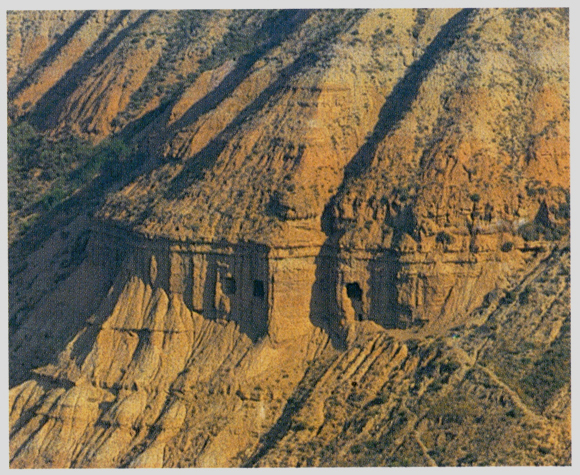 Más difícil resulta pretender definir el urbanismo imperante en tal «ciudad». Hay que suponer que la subida a los castros, condicionada por la presión de las invasiones, llevó a construir a toda prisa las murallas, a habilitar el espacio interior de la forma más adecuada para que acogieran al mayor número de defensores posible, siempre teniendo en cuenta que el criterio lo disponían las autoridades militares de cada lugar y que las gentes más pobres, si no podían aportar fuerza militar u otros servicios, serían en principio los excluidos de la defensa común, en caso de no caber todos. Por iguales razones hay que suponer que la comodidad en el interior del recinto fortificado era una cualidad que no se tenía muy en cuenta y que en general la población viviría hacinada y en condiciones muy precarias de bienestar y de salud. Sólo una parte se ciñe con murallas, seguramente fue una solución dictada por razones militares. El resto de las gentes que vivían en las villas abiertas de la tierra llana buscaron sus propias soluciones: permanecer en Varea; retirarse a castros menos fuertes pero con alguna defensa (Villamediana o Lardero), enmascararse en el terreno en covachas o ribazos en los que fuera más sencillo pasar desapercibidos o buscar tierras más seguras en otras latitudes. Los castros pasaron a ser un elemento muy característico del nuevo hábitat de la zona y en general se convirtieron en las nuevas «ciudades» que con el tiempo configurarían el mapa político de las distintas regiones. En nuestro caso, el castro de Monte Cantabria es un fuerte impulso hacia el traslado de la población a la actual Logroño d) Las cuevas. Otra alternativa a la situación creada por el miedo bien fundado en los trastornos producidos por las invasiones fue la de huir de terrenos abiertos y fácilmente vulnerables y refugiarse en cuevas76 (Fig. 146). El fenómeno, de apariencia geológica, pero en realidad elaborado por la mano del hombre, tradicionalmente en la concepción popular se ha venido relacionado con la dominación árabe. Son las «Cuevas de Moros»o las «Boticas de los Moros». Cualquiera que haya recorrido la región siguiendo el curso de sus ríos, necesariamente se habrá quedado sorprendido por los agujeros que salpican cualquiera de los farallones que caen sobre las vegas o el cauce mismo de los ríos. Al occidente, todavía en la provincia de Burgos, ya en el límite mismo con La Rioja, se ven no lejos de la carretera nacional 120. Ya en la comunidad autónoma de La Rioja, el río Tirón nos los ofrece en su margen izquierda a la altura de Leiva y luego hasta Cerezo del Río Tirón. El Najerilla ve sus cortes geológicos de la Era Terciaria horadados de manera muy abundante en Nájera, y río arriba, a la altura de Camprovín, Baños de Río Tobía, Bobadilla, etc. En el Iregua son famosas las cuevas de Albelda 77, pero hay muchas más: las hay entre Alberite y AIbelda, en Los Palomares de Nalda, en Islallana y en Castañares de las Cuevas. Menos visibles son las de la margen izquierda del Leza, a la altura del pueblo del mismo nombre si no se entra en el caso urbano, pero desde éste las cuevas son y constituyen un interrogante siempre dibujado en el horizonte. Sin duda, el río que lleva la palma es el Cidacos. En cuanto se abandona Quel, río arriba, las oquedades no dejan de vigilarnos hasta Arnedillo, en las rocas de la margen izquierda del valle. Muy numerosas e importantes son las de Arnedo; abundan entre Arnedo y Herce y son impresionantes en las rocas que dominan éste último pueblo; revisten particular interés las de Santa Eulalia Bajera y sobre todo las de Santa Eulalia Somera. Y para no ser menos la cuenca del Alhama también está adornada con las cavidades del terreno, hasta el punto de ofrecer en Inestrillas el poblado rupestre más alucinante de la región. Su distribución no es caprichosa. Se puede afirmar de manera general que se dan una serie de características comunes a todas ellas. Así, por ejemplo, todas se hallan excavadas a una cota de altura más o menos similar: ni en el valle ni en la sierra. Están construidas en función del agua cercana de los ríos. Son verdaderas fortalezas, que dan la impresión de haber sido elegidas como morada en previsión de eventuales ataques o agresiones de cualquier índole. Las que aquí consideramos están excavadas o talladas de acuerdo con una tradición arquitectónica clásica de paredes verticales, techos pIanos y aristas cortándose en ángulos rectos, incluso manifestando dentro de lo posible un plano racional de habitabilidad y sanidad 78.