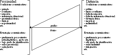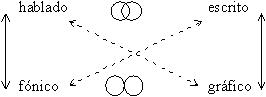 Las flechas continuas del esquema designan relaciones estrechas, las flechas interrumpidas relaciones débiles. Los círculos indican que entre los medios fónico y gráfico hay una relación discreta, un límite claro. Se excluyen mútuamente, mientras que entre la concepción oral y escrita puede haber formas de transición. En los últimos años, Peter Koch y Wulf Oesterreicher, siguiendo en la línea de Söll, propusieron para las dos concepciones del hablar los términos de lenguaje de inmediatez o de proximidad ("Nähesprache") y lenguaje de distancia ("Distanzsprache"), definiendo las características de cada modalidad y hablando de un "continuo" entre las dos, correlacional con la realización en uno de los dos medios (esq. 2).