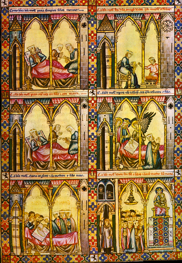 SI, realmente estuvieron muy de moda, todo tipo de bebedizos o recetas que mitigaran o acabaran con la impotencia y la falta de descendencia en las parejas (30). Durante la Plena y Baja Edad Media la fuerza motriz de la existencia del mundo era Dios, Y era Dios igualmente, en consecuencia, el que daba u otorgaba los hijos a las parejas, La divinidad, y con ella a María (31), como madre del Hijo de Dios, Jesús, era a quien por su maternidad divina más gente acudía con sus peticiones de descendencia. Cuando la esterilidad era clara, el último recurso era el milagro o la petición de la generosidad del Todopoderoso. Asi nos lo cuenta la cantiga 347 del Rey Sabio: