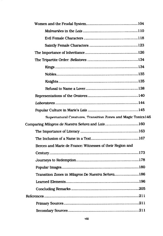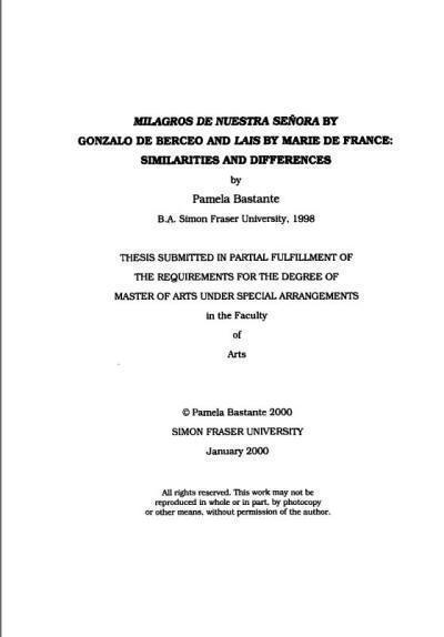 The Camino de Santiago is credited with many cultural and religious exchanges in the Middle Ages. My study will analyze the work of the Spanish poet, Gonzalo de Berceo, and the French poet, Marie de France, as an exarnple of the cultural exchanges between France and the iberian Peninsula by means of the Camino de Santiago in the twelfth and thirteenth centuries. Even though these writers belong to different social backgrounds, and composed their texts for distinct purposes, we find similarities in their works. These two medieval authors have often been studied separately but it is my goal to demonstrate their simiiarities. Chapter 1 gives a socio-political overview of the lberian Peninsula during the thirteenth century and demonstrates how these factors influenced Berceo's Milagros de Nuestra Seriora. We will see how it integrates popular elements into a learned genre to influence and attract pilgrims on their way to Santiago de Compostela. Chapter 2 is the analysis of two of Berceo's milagros: "El parto maravilloso" and "De como Teofilo fizo carta con el diablo de su ânima et después fue convertido e salvo". Chapter 3 looks at the context in which Marie de France wrote her Lais. We observe the learned techniques as weli as the popular details of her region that transfonn oral tales of Breton and Norman folklore into highly polished octosyllabic verses. Chapter 4 is where we determine the mutual influences that exist in the composition of the Lais and Milagros: the importance of Antiquity in medieval texts, and popular images and refrains. The initial goal that I proposed for this study has been accomplished to a degree. I have been able to prove that Gonzalo de Berceo and Marie de France share many similar elements in their texts. Even though they were both writing in different centuries and regions, and about different subjects, it is obvious that the "Camino de Santiago" played a large role in the exchange of cultural traits and historical events. I have only just begun to scratch the surface of this vast area of study. It is my hope to continue discovering other similarities present in the works of these authors during at UBC.