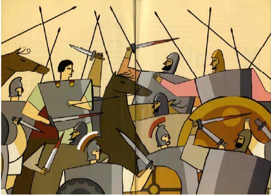 Todo parece sugerir a un esfuerzo de los responsables de la publicación por ocultar interesadamente la actitud etnocentrista y xenófoba de Aristóteles, sólo esperable desde una perniciosa defensa de lo "políticamente correcto" que consideraría escasamente recomendable el cuestionamiento ético del padre del pensamiento racional europeo y, por ende, occidental. Y ello aun cuando la realidad ya fue constatada por las fuentes literarias clásicas y ha sido asumida como tal en tanto que resultado de un contexto histórico en la medida en que dichas informaciones figuran incorporadas entre los contenidos transmitidos actualmente en la escuela, como demuestra la inclusión del ya citado texto de Plutarco en la guía para el profesorado de 1° de ESO elaborada por el Departamento de Ediciones Educativas de la editorial Santillana (Madrid, 2007). Porque, a pesar de la existencia de una serie de hitos inamovibles que nunca faltan en cualquier tipo de aproximación biográfica a Alejandro, pero también de la ausencia de homogeneidad en los planteamientos de cada autor -y editor- y, en consecuencia, de las diferencias existentes entre las diversas aproximaciones practicadas a la hora de seleccionar las informaciones con las que elaborar una biografía de Alejandro destinada al público infantil y juvenil, la orientación -y, por ello, manipulación- interesada del relato en una dirección muy determinada, por loable que pueda resultar ésta dentro de una educación en valores de igualdad y solidaridad entre todos los seres humanos en el marco de fenómenos de contacto entre culturas diferentes, no deja de falsear la historicidad de una realidad que debe ser entendida necesariamente en los términos estrictamente históricos que definen una época muy alejada de la nuestra. No olvidemos que son la guerra y la conquista los fenómenos que definen el perfil biográfico de Alejandro: un rey guerrero y conquistador que, gracias a la victoria sobre sus enemigos, llega a extender sus dominios sobre buena parte del mundo conocido en aquella época. Resulta tan evidente como inevitable que todas las publicaciones examinadas hacen de la guerra el tema clave de su discurso, y en este marco el tratamiento literario e iconográfico de la violencia constituye un elemento significativo a la hora de caracterizar la aproximación que cada una de ellas hace a la figura y las hazañas de Alejandro. Más allá de sendas representaciones del ejército macedonio en Tiro y de las tropas de Poros (pp. 67 y 119 respectivamente), las escasas láminas incorporadas por JOLY (2007) huyen de cualquier tipo de violencia, y ésta tampoco es objeto de especial atención a lo largo del relato. FORNI (1992) es el único autor que recuerda el suplicio de Batis, gobernador persa de Gaza, arrastrado por el carro de Alejandro, y hasta lo reproduce entre sus ilustraciones, pero ello no deja de ser una excepción dentro del tono general de la narración. El aparato gráfico de ADAMS (2006) resulta especialmente neutro por cuanto consiste casi exclusivamente en fotografías de restos arqueológicos y obras artísticas, pero su texto hace hincapié en la crueldad de la conquista y cifra el coste humano de la misma en 750.000 muertos. THEULÉ (1996) se centra fundamentalmente en los aspectos técnicos de la guerra -la falange macedónica y el armamento de los soldados, el diseño de los navíos, cuestiones de poliorcética, etc.-, y en una línea similar se mueve CHRISP (2000), si bien este último no ahorra imágenes violentas como los dibujos que reproducen la destrucción de Tebas (pp. 14-15), el asedio de Tiro (pp. 22-23), la batalla de Gaugamela y la muerte de Darío (pp. 29-31), la tortura aplicada a los conspiradores arrestados (pp. 34-35), la muerte de Clito a manos del propio Alejandro (pp. 34-35) o los soldados devorados por los cocodrilos en los ríos de la India (39). Más allá llega MIRANDA (2004), que adorna su portada interior con una espada ensangrentada y reproduce escenas de batalla y saqueo con enfrentamiento directo entre sus protagonistas y campos de batalla en los que yacen cadáveres decapitados (pp. 4-5, 14-15, 16-17, 26-27, 36-37). Pero es sobre todo ROBINS (2007) quien, precisamente en el marco de la actitud desenfadada desde la que realiza su aproximación a la figura de Alejandro, practica en sus dibujos un tratamiento gráfico de la violencia especialmente crudo y sangriento aprovechando muchos de los episodios de este tipo recogidos a lo largo de todo el libro, desde la escena de Filipo atravesado por una espada (p. 45) hasta, ya tras la desaparición de Alejandro, la imagen de la cabeza decapitada de Olimpíade y la muerte de Roxana y de su hijo entre cuchillos y salpicaduras de sangre (p. 173) -cuando estos dos últimos en realidad murieron envenenados-, pasando por la mutilación de las manos que los persas infligen a sus prisioneros macedonios poco antes de la batalla de Isos (pp. 72-73) -ROBINS (2007) es el único autor que recuerda tanto literaria como gráficamente este episodio-, las cabezas atravesadas por flechas, los soldados quemados vivos y los cadáveres flotando en el mar durante el asedio de Tiro (pp. 82-84), las piernas cortadas por carros armados con cuchillas en Gaugamela (p. 98), la agonía de Darío atravesado por una lanza (p. 110), la muerte de Clito a manos de Alejandro (p. 123; vid. supra, p.32 en este trabajo) y la cabeza de Parmenión ofrecida a Alejandro en una bandeja (p. 118) en tanto que la primera de una colección de cabezas de traidores y conspiradores decapitados como consecuencia de las medidas represivas de un Alejandro que sonríe mientras afirma "La pondré aquí con la otra" (p. 126) o que, junto al esqueleto de Calístenes encerrado en una jaula, dirige al lector excusas como "Bueno, ya me conocen, firme pero justo" (p. 130). Objetivamente, el desenfado y la ironía no justifican un tratamiento tan crudo de la violencia como el elegido por ROBINS (2007), pero meno