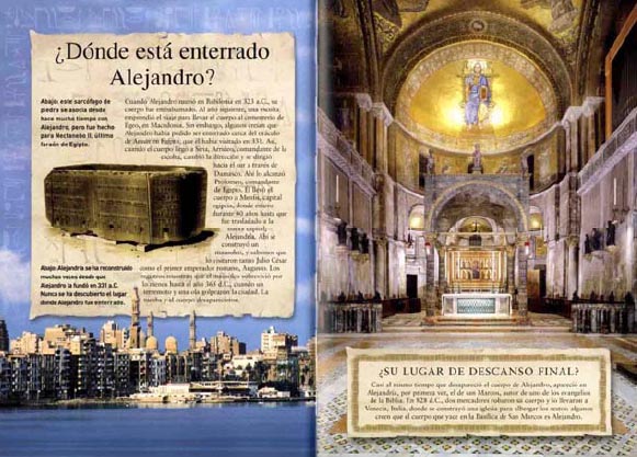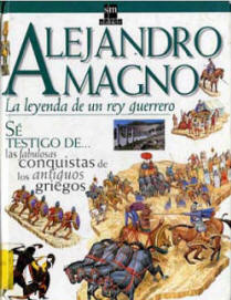2000: Peter CHRISP, Alejandro Magno. La leyenda de un rey guerrero, SM, Madrid orig. Londres, 2000). Publicación de marcada finalidad didáctica basada en la complementariedad entre un texto cargado de información y una imagen que combina la reproducción fotográfica de obras artísticas en formatos diversos con el dibujo en perspectiva de reconstrucciones de escenarios y arquitecturas de acuerdo con el sistema 3D -generalizado en este tipo de publicaciones y compartido a menudo con formatos tales como los de las guías turísticas- en el marco de un formato a doble página generalmente apaisado que reproduce exactamente la edición original anglosajona realizada por Dorling Kindersley Ltd. De igual modo, la colección en la que se enmarca constituye la versión traducida de la publicada por dicha editorial anglosajona. Incorpora un índice alfabético al final.