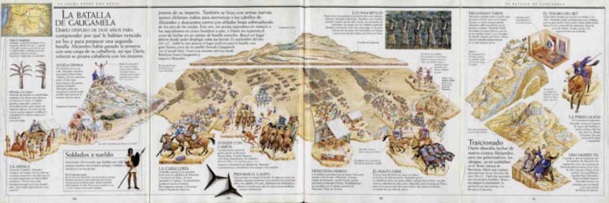 Se trata de un recurso enormemente eficaz de cara a hacer atractiva la obra al lector al que va dirigida que delata asimismo los particulares propósitos didácticos de dichos trabajos. CHRISP (2000) añade a ello la utilización de dibujos en perspectiva 3D convertidos en el eje argumental de la mayor parte de las dobles -y hasta cuádruples, como en el tratamiento de la batalla de Gaugamela- páginas en las que se distribuye temáticamente la información y, en consecuencia, asociados de un modo mucho más íntimo con el texto a través del cual se incorpora dicha información.