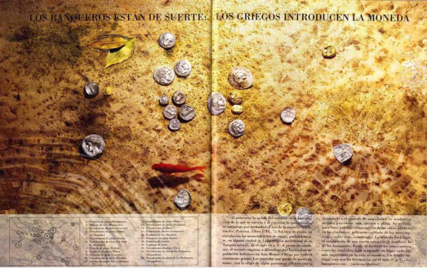 Curiosamente, y ya lo apuntábamos al principio, es una de las publicaciones cronológicamente más "antiguas" dentro de nuestra selección, la que, en nuestra opinión, alcanza un mayor grado de imbricación entre texto e imagen a la hora de valorar el componente didáctico del resultado. Por lo que se refiere no sólo a la presencia del aparato gráfico -tanto dibujo como fotografía-, sino a su utilización como vía para una aproximación paralela -y en ocasiones hasta idependiente- a las informaciones transmitidas a través del texto, la obra de THEULÉ (1996) supera con mucho a las demás seleccionadas y lo aproxima al género del "libro-álbum". Los diferentes niveles de lectura planteados por la imagen a lo largo de este trabajo descubren vías complementarias e incluso alternativas de comprensión y de disfrute para los diferentes lectores que se aproximan a él, los cuales experimentan el placer derivado de los numerosos "descubrimientos" que surgen a lo largo de sus páginas. A los ejemplos ya comentados podemos añadir la doble página titulada "Los banqueros están de suerte: los griegos introducen la moneda" (pp. 78-79). Aparentemente en ella se muestra un puñado de monedas arrojadas descuidadamente al fondo de un estanque, pero esta imagen de fondo no es sino un mapa del mar Mediterráneo del que ha desaparecido cualquier delimitación cartográfica y en el que la ubicación aparentemente casual de cada una de las monedas indica en realidad la localización de las ciudades donde cada una de ellas fue acuñada, algo en lo que el lector puede -o no- reparar dependiendo del tipo de asociación que sucesivamente establezca entre la imagen en general, el pequeño mapa que aparece en el ángulo inferior izquierdo y la leyenda que lo acompaña. El lector podrá limitarse a valorar estéticamente el fondo del estanque o ir más allá y descubrir la vinculación que une esa imagen con el resto de las informaciones presentes en la lámina. Nada puede restar mérito a la labor de diseño realizada en este caso por Olivier Laboureur.