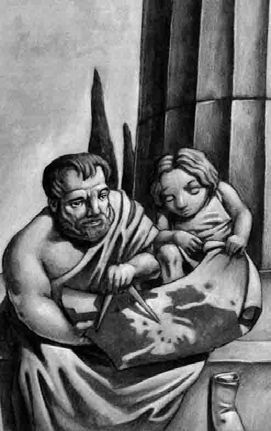 Se advierte una diferencia más que notable entre el tipo de protagonismo que cada una de las publicaciones seleccionadas concede a la ilustración en tanto que recurso narrativo. En primer lugar, llama la atención comprobar cómo los dos trabajos más recientemente publicados son aquéllos en los que, con la única excepción de la cubierta y la contracubierta, en todas las ilustraciones se prescinde del color. En el caso de JOLY (2007), las ilustraciones de Max Hierro resultan tan escasas en número como limitadas en cuanto a atractivo: una sola en color ocupando la portada y diez en tonos grises a lo largo del texto -a razón de una por capítulo-, con retratos de Alejandro que lo presentan con una apariencia aniñada. Ciertamente, el repaso de las diez ilustraciones contenidas en el libro equivale a la enumeración sucesiva de los principales hitos argumentales de cualquier relato de la vida de Alejandro -la doma del caballo Bucéfalo, la relación de Alejandro con su madre Olimpíade, el episodio del nudo gordiano, el asedio de Tiro, la estancia en Egipto, la conjura del macedonio Filotas, el magisterio de Aristóteles (reproducida a continuación), la victoria sobre el rey Poros, la negativa del ejército a seguir adelante en la India y la muerte de Alejandro en Babilonia-, pero más allá del dicha relación, ningún otro elemento las vincula con el texto, a diferencia de lo que sería aconsejable en una publicación de este tipo.