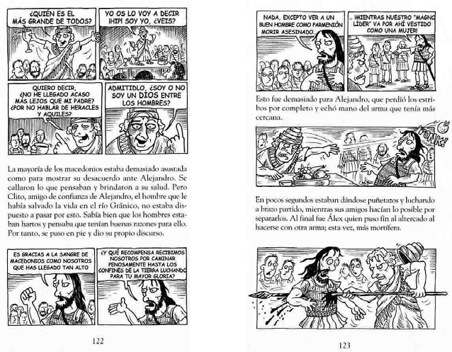 1996: Frédéric THEULÉ y Olivier LABOUREUR, Alejandro y Oriente, Anaya, Madrid (orig. París,1995). Libro asimismo de carácter didáctico pero enormemente innovador en la medida en que la acertadísima interrelación entre texto e imagen lo aproximan al género del "libro-álbum". Formalmente se estructura en una sucesión de dobles páginas en la que se intercalan las referidas a la peripecia vital de Alejandro con otras muchas referidas a ámbitos de interés del mundo griego antiguo en general y en las que alterna la información generalista con la referencia erudita, el elemento humorístico con el juego visual. Concebido en el marco de la colección "Revista de la Historia" -traducción de la francesa "Regard d'Aujourd'hui"-, sus contenidos textuales y gráficos permiten la práctica de diferentes niveles de aproximación en función de las edades, conocimientos e intereses de los lectores que respeten las "Precauciones" que se indican en la contraportada, consistentes en "dejar al alcance de los niños, los adolescentes y los adultos".