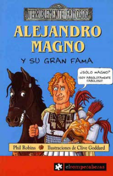 Entre la literatura orientada al público infantil y juvenil que aborda la figura de Alejandro contamos en primer lugar con varias novelas históricas. La primera destinada a un público juvenil podría ser Alejandro el Grande, del autor griego Nikos Kazantzakis (Editorial Carlos Lohlé, Buenos Aires, 1983; orig. Atenas, 1940), que abarca desde la doma de Bucéfalo hasta la muerte del protagonista. Por lo que se refiere al marco cronológico de nuestro análisis, el ciclo Los misterios de Alejandro Magno, del inglés P.C. Doherty, se halla integrado por las novelas Alejandro Magno en la casa de la muerte (Edhasa, Barcelona, 2003; orig. The House of Death, 2001), El ateo (íd., ibíd., 2004; orig. The Godless Man, 2002) y Las puertas del infierno, (íd., ibíd., 2006; The Gates of Hell, 2003), y muestra a un Alejandro detective que investiga casos de asesinato acaecidos en su entorno más próximo durante su expedición por Asia. Y más reciente todavía es la versión destinada al público más joven que de su trilogía antes mencionada ha elaborado Valerio Massimo Manfredi bajo el título Aléxandros (Montena, Barcelona, 2007; orig. Il romanzo di Alessandro, 2005), publicada por Montena en tanto que espacio reservado por el grupo Random House Mondadori -al que dicha editorial pertenece- para el género de la literatura juvenil contemporánea. Una mención particular merece otro tipo de publicación sobre Alejandro destinada por vía indirecta al público juvenil como es la guía didáctica que sobre la película de Oliver Stone ha publicado Fernando Lillo Redonet, Guías didácticas de Alejandro Magno (2004) y El león de Esparta (1961) (Áurea, Madrid, 2005). El autor plantea cuestiones relativas al contenido de la película y sugiere actividades destinadas a relacionarlo con la información de las fuentes antiguas y modernas para así explicar aspectos históricos que la película tergiversa, todo ello en el marco de los temas tratados en el currículo de Cultura Clásica -mitología y religión, filosofía, consideración de la mujer, transmisión manuscrita, etc.-. Incluye una selección de lecturas -obras de autores clásicos, novelas históricas- direcciones de páginas web, una valoración de sendos documentales producidos por Discovery Channel (1996) y National Geographic (2004, ya mencionado supra) y una bibliografía básica sobre Alejandro, su época y el tratamiento cinematográfico del que ambos han sido objeto hasta la fecha. Aun cuando la película de Stone ha sido recomendada para mayores de 13 años y el libro de Lillo constituye una herramienta didáctica escrita por un docente y destinada a otros docentes para que éstos trabajen con sus alumnos, resulta de interés por cuanto el currículo escolar contempla el tratamiento de la figura de Alejandro como materia en 1° de ESO en la asignatura obligatoria Ciencias Sociales, Geografía e Historia y en 4° de ESO en la optativa Cultura Clásica. Precisamente el hecho de que el tema sea impartido obligatoriamente a todos los alumnos en 1° de ESO determina en buena medida la edad de los destinatarios de la literatura infantil y juvenil existente sobre Alejandro y, en consecuencia, la orientación de este subgénero hacia ese segmento de lectores por parte de los editores, dadas la utilidad didáctica que dicha literatura permite incorporar y la dificultad que para este alumnado supone el manejo directo de los textos clásicos. Por todo ello encontramos mas que justificado nuestro interés por el modo como la persona y las hazañas de Alejandro han sido tratadas literariamente en fechas recientes con vistas a su presentación específica ante un público infantil y juvenil. De hecho, resulta significativo constatar cómo, sin haber llevado a cabo una búsqueda exhaustiva, para la realización del presente análisis no hemos encontrado especiales dificultades en localizar y acceder a siete biografías de Alejandro destinadas a niños y jóvenes publicadas en su mayoría en fechas muy recientes (2007 [bis], 2006 y 2004, frente a 2000, 1996 y 1992). De todas ellas sólo una ha sido editada originalmente en España, mientras que el resto son traducciones de obras publicadas en francés y en inglés. Pero todas se enmarcan dentro de colecciones fundamentalmente de carácter biográfico -que repasan la vida de personajes como Aníbal, Cleopatra, Leonardo da Vinci, Marie Curie o Einstein- o de temática histórica o mitológica -junto a títulos como Un castillo en guerra, Aztecas o Los doce trabajos de Hércules-, esto es, dentro de formatos más o menos definidos por una determinada política editorial. Ordenadas de acuerdo con la mayor proximidad de su fecha de edición, las publicaciones seleccionadas son las siguientes: 2007: Phil ROBINS, Alejandro Magno y su gran fama, El Rompecabezas, Madrid (orig. Londres, 2005). Su publicación en la colección "Terriblemente Famosos" (orig. "Dead Famous") da idea del espíritu que anima esta divertidísima biografía para lectores de muy diversos niveles gracias a la práctica de un humor inteligente a través del detalle y de una permanente desmitificación a través de la ironía. Contrasta el tono desenfadado de la narración con la historicidad y abundancia de informaciones que proporciona un relato en tercera persona a lo largo del cual se intercalan secciones "históricas" como "Magnas Historias" y "Magnos Tiempos", e imaginarias como "El diario secreto de Alejandro", escritos escolares, cartas intercambiadas con Filipo y con Olimpíade, postales enviadas desde los diferentes lugares de sus dominios y portadas del diario "El Correo Macedonio" -cuya difusión se amplía desde Macedonia hasta el conjunto de Asia conforme se extienden las conquistas de Alejandro, hasta incluir una edición "disponible en jeroglífico" tras la llegada a Egipto-. Todo ello combinado con una ilustración de dibujo muy sencillo que se aplica lo mismo en una sola escena que en un auténtico cómic, en gran