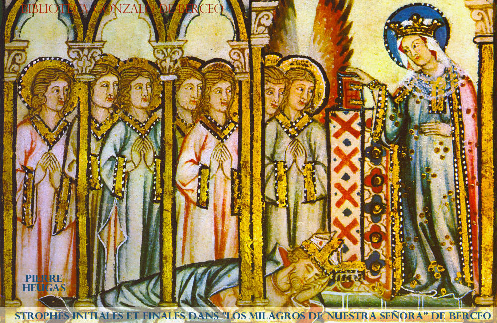 On voit done que de la même façon que dans la poésie courtoise, la relation de l'homme à la Vierge est une relation de vasselage. Le dévot sera toujours le serf; ce qu'illustre parfaitement le miracle La boda y la Virgen. Cette breve analyse me dispensera de commenter d'autres exemple nombreux de l'équivalence service-guerredon dans les strophes 120, 138, 139, 140, 159 (avec dans cette dernière strophe le nom de Marie lié à celui de son fils dans l'effet de sa grâce descendante) ou encoré de la strophe 329 qui montre que celle qui sauve sa statue de l'incendie est aussi celle qui sauve ses «siervos» du «fuego perennal» (329).