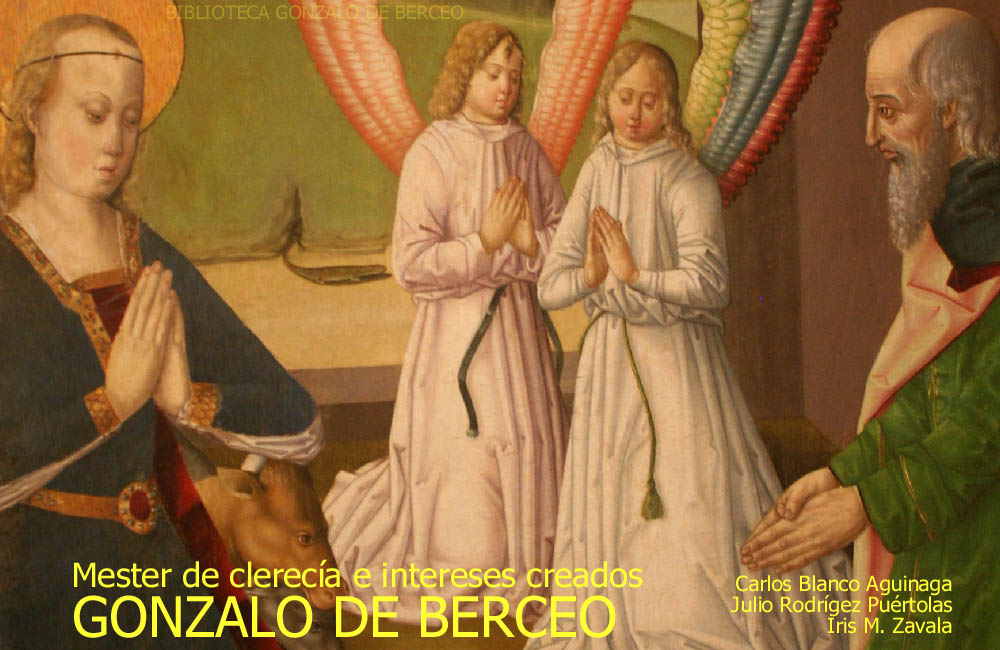 El Libro de Apolonio, por su parte, se relaciona con los esquemas de la vieja novela bizantina de aventuras y viajes, de final feliz y con las habituales moralizaciones. Pero es la obra de Gonzalo de Berceo la que se destaca señera entre la literatura del mester de clerecía del siglo XIII. El sacerdote Berceo pertenecía al monasterio benedictino de San Mi-llán de la Cogolla, en la Rioja, de donde probablemente fue notario; vivía aún a mediados de la centuria. Toda su abundante obra conservada es puramente religiosa: tres vidas de santos, tres poemas marianos, tres poemas doctrinales y algunos himnos. Suele manejar la crítica, al tratar de Berceo, varios tópicos contra los cuales conviene estar alerta, tales como «sencillez», «ingenuidad» y «popularismo». Lo que en verdad se oculta tras esa aparente «sencillez» de Berceo no es sino una gran complejidad y habilidad para cumplir unos fines bastante concretos y determinados: la propaganda de su monasterio y la defensa de los intereses del mismo —semejante a lo que vimos al tratar del Poema de Fernán González— a un nivel local; la propaganda y la defensa de su religión, y al propio tiempo del sistema y orden establecidos, a un nivel más general. Berceo acudirá para ello a diferentes recursos, como el uso de elementos juglarescos y de la captatio benevolen-tiae o falsa modestia para acercarse al pueblo, o como la casi continua referencia al escripto o libriello que le inspira y le sirve de modelo, manejando así el respeto y temor que las masas iletradas sentían por la letra escrita. La vida de San Millán es, en este sentido, una pieza maestra, en que Berceo recoge viejas tradiciones de su monasterio, la más importante la de un milagro realizado por el santo después de muerto: su intervención, nada menos que al lado de Santiago Matamoros, en una batalla entre leoneses y castellanos —dirigidos respectivamente por el rey Ramiro y el conde Fernán González— contra los musulmanes. En efecto, en el cielo,