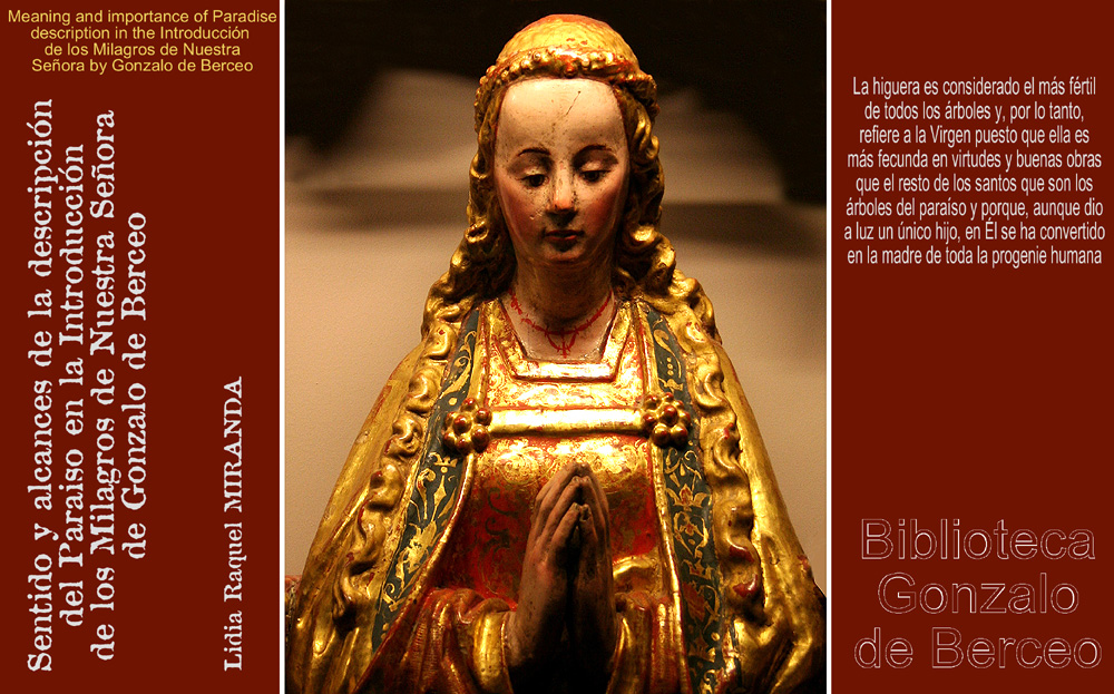 Abstract: The Introduction of Los Milagros de Nuestra Señora by Gonzalo de Berceo shows a locus amoenus, where the pilgrim rests, that identify with paradise (c. 14 a y b). The source in that lawn (c. 3) divides in four branches (c. 21) that evoke the rivers of paradise, and the trees that produce healthful and beautiful fruits (c. 4) represent the abundance and happiness preceding the original sin. In this context, Virgin Mary image is the redemption matrix that will repair the fault committed by Adam and Eve because of her mediation between Christ and men. The stanzas' text by Gonzalo de Berceo we have analyzed focus in theological history of humanity of latest days, the enunciator present, which is understood starting from the originating times. So, the lawn description connotes the lost paradise and paradisiacal state which recovery is a certain possibility to men who believe and devote Virgin Mary.