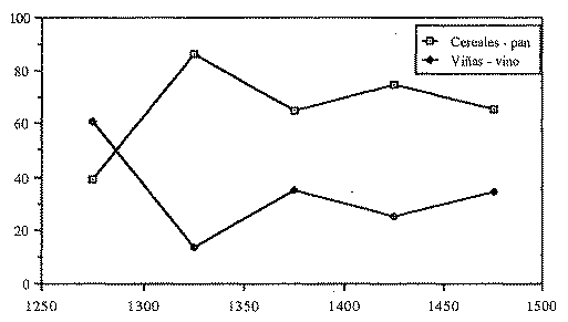 Se advierte un mayor equilibrio en el número de viñas y sembraduras en esta segunda mitad del siglo, pero siempre con claro predominio de estas segundas: cereales 220 puntuaciones con 64,90% frente a viñas-vino con 119 veces y un 35,10%. Encontramos tres ventas simples frente a once donaciones o ventas graciosas con fines religiosos, de sufragios por difuntos sobre todo. Sólo un par de datos concretos se nos da sobre el precio: se vende una viña de "tres cavaderas de parrales" en la Hayuela por precio de 500 mrs., quizá la presencia en los linderos encareció la compra, aparte la consideración de que era un parral, junto a otros parrales (CDAL 192). En cambio, otra viña adquirida a compras parciales sólo alcanza el valor medio de 58,33 mrs. por cavador (CDCC 138 139, 140). En las avenencias o acercamientos contractuales de los concejos se insiste de nuevo en el respeto a viñas, sembrados y plantaciones. Aparecen concentradas en determinados pagos las viñas y los parrales, como en la zona de Santo Domingo-Corporales, en tanto que otros abundan en tierras de pan llevar, como en los Molinos.