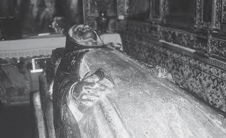 San Gonzalo de Amarante Finalmente no queremos dejar de aludir al caso de San Gonzalo de Amarante, cuya vida es algo posterior a la de los santos que hemos tratado, pero como ellos fue también arquitecto y ponteador, siendo muy venerado por los peregrinos del Camino portugués a Santiago de Compostela[79]. Los hagiógrafos sitúan su nacimiento en 1187. Después de ordenarse sacerdote realiza una larga peregrinación a Roma y a Tierra Santa. A su regreso se instala en Amarante, viviendo vida de ermitaño y edifica allí mismo una iglesia en honor de la Virgen. Más tarde entra en contacto con los dominicos establecidos en Guimaraes, una de las nuevas órdenes religiosas que se difundían por Europa entonces, y toma él allí mismo el hábito. Después vuelve a Amarante y construye un puente sobre el río Tamega conmovido por las dificultades que tenían los viandantes para vadear el río. En su construcción se produjeron numerosos milagros. A su muerte en 1259 es enterrado en la iglesia o capilla que habría construido que pronto se convierte en un afamado centro de peregrinación. Veinte años después en 1279 la iglesia se titulaba ya de San Goncalo lo que evidencia la difusión de su devoción[80]. Conservamos la estatua yacente medieval del santo que todavía hoy recibe culto en el convento de San Gonzalo donde tiene dispuesto su sepulcro de granito en la capilla mayor en el lado de la Epístola. Sabemos que este convento fue erigido en 1540 por Juan III si bien se acabó casi un siglo después. Pero la efigie debió de pertenecer a una iglesia anterior. La estatua es de piedra calcárea policromada y representa al Santo con el hábito dominicano, un libro en la mano derecha y el báculo en la izquierda. A sus pies se ha esculpido un puente de dos arcos con dos contrafuertes que será habitual en la iconografía del santo como podemos ver en muchas de sus efigies del siglo XVI-XVIII[81]. Su cabeza apoyada en doble almohada presenta los rasgos del rostro completamente desfigurados a causa del continuo devenir de sus devotos y peregrinos que tocan el rostro y lo besan testimoniando de esta manera que su culto permanece hoy todavía vivo. Hemos visto cómo el Camino de Santiago, convertido en itinerario cultual sembrado por los sepulcros de los santos que se encontraban a la vera del camino y que los peregrinos debían visitar, propició la figura de un nuevo tipo de santo, la del santo constructor entregado a la atención de los peregrinos. Sus sepulcros recibieron también culto e incluso algunos de ellos como los de Santo Domingo, San Juan de Ortega o San Gonzalo dieron lugar a santuarios que desde entonces estuvieron plenamente integrados a la ruta jacobea.