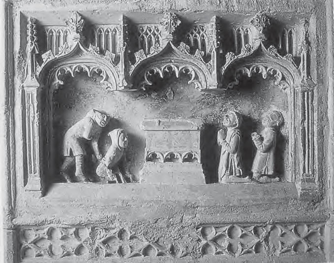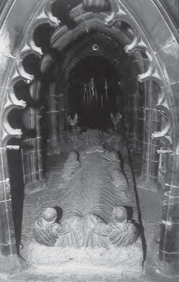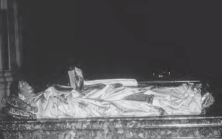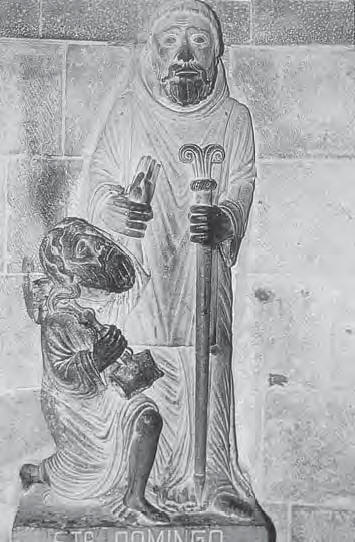 El Sepulcro de Santo Domingo de la Calzada Es más que probable que hacia 1135-1140, cuando escribía Aymeric su célebre guía, los peregrinos a los que invitaba a visitar la tumba de Santo Domingo, contemplasen todavía el primitivo sepulcro de piedra que había acogido sus restos en 1109 hubiera sido o no realizado por el mismo santo como pretende la tradición. No sabemos con seguridad dónde fue depositado el sarcófago, pero lo más lógico es pensar, que habiendo construido Santo Domingo una iglesia en este lugar que ya había sido consagrada, como hemos dicho, en 1106, por el obispo D. Pedro Nazar, se dispusiese en ella su sepultura, quizás en algún atrio exterior como sugiere Bango Torviso[33]. Según la más antigua documentación que ha llegado hasta nosotros parece ser que pronto, a principios de la década de los veinte, ya se había establecido allí una comunidad dúplice para custodia y protección del sepulcro, que acabaría integrándose unos años después por sólo exclusivamente hombres. El templo que pronto adquirió el rango de colegiata era gobernado por un abad bajo la tutela del Obispo de Calahorra. El aumento del número de peregrinos que se detenían para visitar la tumba del santo, unido a otros factores en los que ahora no entramos, llevaría al obispo D. Rodrigo de Cascante a construir una nueva iglesia que acogiera en su interior la tumba santa, y que según los Anales Compostelanos se iniciaría en 1158, fecha de la colocación de la primera piedra. El proyecto sabemos que fue confiado al maestro Garsion quien concibió una iglesia monumental, con cabecera con girola con tres ábsides radiales y una tribuna por encima que se prolongaba por las naves colaterales siguiendo el modelo de la catedral de Santiago. Aunque recientemente se ha sugerido la teoría de que el sepulcro primitivo del santo se habría dispuesto en la cabecera, y sólo siglos después se habría trasladado al crucero meridional donde se encuentra en la actualidad, pensamos como Bango Torviso, que éste fue el lugar que siempre ocupó la tumba santa de modo que el arquitecto proyectó el edificio para incluir en él «el locus sanctus». Si el sarcófago se hubiese trasladado a principios del siglo XV de la cabecera al crucero sur, como opina Fr. Español, sería difícil explicar que se hubiera colocado, tal como ahora lo vemos, en posición oblicua con respecto al eje del templo, anomalía que en cambio tendría justificación en el caso de que se hubiese querido respetar desde el principio el lugar santo[34]. Por otra parte esta misma disposición se aceptó también para otros sepulcros de santos que inauguraban por esos mismo años, una nueva iglesia-relicario, como el sepulcro de los santos mártires Vicente, Sabina y Cristeta situado también en el crucero sur de la basílica de San Vicente de Ávila concluida hacia 1200. De esta manera se facilitaba además el acceso directo de los fieles al sepulcro desde la puerta Sur. No sabemos si este espacio ocupado por el sarcófago se prologaba hacia el Este con una posible absidiola abierta en el muro del crucero o no. Las renovaciones que ha sufrido el edificio nos impiden cualquier afirmación en este sentido. Si esta interpretación es correcta, la cabecera y este tramo del crucero estarían terminados ya en 1191, pues un documento de ese año nos informa que la nueva iglesia contiene ya la preciada reliquia[35]. De este modo se cumplía la profecía que la tradición atribuye al propio santo y que se encuentra ya en el oficio del santo desde fines del siglo XIII, el más antiguo hoy por hoy conocido. Al ser interrogado por una devota que por qué el sepulcro que él había fabricado estaba tan lejos de la Iglesia, el santo le contestó «depende de la Providencia Divina no apartarse en absoluto de la iglesia, en un tiempo futuro; porque aunque oy se halle fuera de ella mi sepulcro, en que ha de ser mi cuerpo sepultado; pero esta cierta que, o la Iglesia se ensanchará, cogiendo mi sepultura dentro de sí, o se anchará en ella mi sepulcro con mi difunto cuerpo»[36. Es lógico que por estos años se concibiese trasladar el cuerpo del santo del primitivo sepulcro a una nueva tumba bien dotada artísticamente acreedora de su fama de santidad. De ella nos ha llegado la estatua yacente que data de los primeros decenios del siglo XIII. El modelo se encuentra cerca de Santo Domingo de la Calzada y nos lo proporciona otro sepulcro santo realizado unos años antes, el cenotafio de San Millán de la Cogolla ubicado en la cueva eremética donde había sido primitivamente sepultado, en el monasterio de Suso[37]. La estatua del santo revestida de los ornamentos sacerdotales, sobre la losa sepulcral, aviva a los ojos de los devotos y peregrinos su «presencia» en este lugar, y la «virtud» que de ella se desprende se manifiesta en los milagros representados a sus pies, el de los dos ciegos que recuperan la vista y el de la niña resucitada. En la cabecera una mujer triste representa a nuestro juicio el estado emocional de los peregrinos que se acercan al lugar a solicitar un favor del santo -una curación por ejemplo- y otra mujer alegre, el gozo recuperado por el deseo obtenido por su intercesión de acuerdo con un tópico presente en la literatura hagiográfica de la época[38]. Un monje sentado ante un gran libro colocado sobre un atril y acompañado por otros dos situados en el medio memorizan el culto celebrado en su honor. A diferencia de éste, labrado en mármol, el sepulcro de Santo Domingo fue realizado en piedra policromada. El santo yace recostado sobre la losa sepulcral con la cabeza apoyada sobre un almohadón que dos acólitos, uno a cada lado, sujetan. Representa un hombre de edad avanzada, con la frente surcada de arrugas, los ojos cerrados hundidos en dos grandes cuencas oculares, nariz alargada y labios finos y apretados. Lleva barba, bigote y cabello que cae en bucles rizados y viste hábito monástico con cogulla. Su cuerp