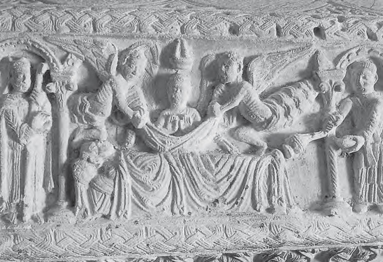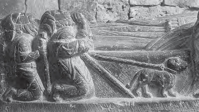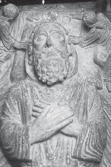 El Sepulcro de San Juan de Ortega Otro arquitecto santo del Camino fue San Juan de Ortega. Como en el caso de Santo Domingo tampoco disponemos de una biografía cercana a su vida. La más antigua que conocemos se recoge en un ejemplar de las Vitae Sanctorum del siglo XIV (B.H.A. cod. 103) procedente de Burgos, y si no contamos ya con la de J. De Sigüenza, en la Historia de la Orden de San Jerónimo, Libro III, cap. X o la de Enrique Flórez en la España Sagrada, obras ya muy tardías[55]. La tradición lo ha considerado siempre discípulo de Santo Domingo de la Calzada y colaborador suyo. Muerto éste y perdida la tranquilidad del reino a causa de los desmanes cometidos por Alfonso el Batallador, decide en 1112 peregrinar a Jerusalén[56]. Al regreso fue salvado de un naufragio por intercesión de San Nicolás de Bari, prometiendo edificar una iglesia en su honor. Después se instala con dos sobrinos en los Montes de Oca, zona asolada por malhechores que se dedicaban a asaltar a los peregrinos del Camino. Ahí mismo funda una comunidad de canónigos regulares de San Agustín que, en 1138, Inocencio II puso bajo su protección y dependencia de la Santa Sede. Los monarcas Alfonso VII y después Sancho III le dispensaron también su ayuda, concediéndole importantes donaciones que pondría al servicio de los peregrinos. De su labor como ingeniero se le han atribuido la construcción de varios puentes -los de Logroño, Nájera, Santo Domingo de la Calzada y otro cerca de Cubo de la Bureba- y los siguientes tramos del camino: la calzada y puente entre Agés y Atapuerca y otra más corta desde este lugar al monasterio de Ortega. Construyó también un hospital y sabemos por su testamento, redactado en el año 1152, que edificó allí mismo una iglesia dedicada a San Nicolás, como había prometido, in servitio pauperum in via Sancti Jacob-i5. Su muerte le sobrevino en la ciudad de Nájera el 2 de junio de 1163 y de ahí fue trasladado, como era su voluntad, a Ortega, siendo enterrado en un modesto y sencillo sarcófago de piedra en la iglesia de San Nicolás. Pronto la fama de santidad y los milagros obrados por su intercesión junto a su tumba, atrajo a numerosos devotos y peregrinos, especialmente los que recorrían el Camino a Santiago. A fines del siglo XII se levanta una nueva y espléndida iglesia tardorrománica que no se terminaría hasta mediados del siglo XV y que ha llegado afortunadamente a la actualidad[57]. De estos años data la ejecución de un nuevo sepulcro destinado a honrar mejor, por su calidad artística, los restos del cuerpo santo, y que pensamos pudo haber sido encargado con motivo de su «elevatio corporis» Presenta forma de sarcófago domatoformo, decorado en tres de sus caras y lisa la parte posterior sin duda pensada para estar apoyada junto a un muro. El frente del arca lo ocupa la Maiestas Domini rodeada por una mandorla lobulada y acompañada como es habitual por el tetramorfos. La flanquean, a cada lado, los doce apóstoles dispuestos bajo arquerías sobremontadas por edificaciones torreadas. El parecido de esta iconografía con la del frontal de la urna esmaltada de Santo Domingo de Silos realizada, hacia 1070, ha llevado a R. Sánchez Ameijeiras a considerarla como modelo iconográfico de nuestro sepulcro[58]. El tema, al evocar claramente la Jerusalén Celeste, había sido muy prodigado en sepulcros de los santos, pues no cabe duda que una de las certezas que conlleva el reconocimiento de la santidad de un individuo en su «beatitud celestial». El motivo lo encontramos en el sarcófago de San Martín de Dumio, de fines del siglo XI y en el magnífico sepulcro de los santos Vicente, Sabina y Cristeta en la iglesia de San Vicente de Ávila, de h. 1200[59]. Es una temática que abunda también en numerosos relicarios de la época. Así aparece ya poco después de mediados del siglo XI en la famosa arqueta de San Millán de la Cogolla. Sobre la cubierta figura en la vertiente de este lado la muerte de San Juan, tema -la muerte del santo- habitual de la hagiografía medieval y que aparece en la Península representada tempranamente en la arqueta de San Millán. El santo yace muerto tendido en el lecho cubierto con un lienzo que le llega hasta la altura del cuello, mientras dos ángeles llevan su alma al cielo, en un paño, a modo de la tradicional escena de la «elevatio animae». Una lampara situada encima y en el medio, sirve para evocar el interior de la habitación donde muere el santo y al mismo tiempo encierra también un profundo significado simbólico, el «lumen gloriae» del que participa desde su tránsito al cielo. A uno y otro lado, bajo arquerías, se disponen varios clérigos celebrando la liturgia funeraria que preside un obispo situado junto a la cabecera acompañado por cuatro abades, que repiten el mismo gesto de absolución. A los pies vemos un acolito o diácono con estola sobre el hombro incensando con la mano derecha mientras sostiene la naveta en la izquierda. Le acompañan otros cuatro clérigos, el primero apuntando con el índice el libro cerrado mientras los otros tres los tienen abiertos, siguiendo las prescripciones del ritual. Un interesante documento medieval, el acta del reconocimiento del cuerpo del santo que se llevó a cabo el 1 de marzo de 1474, al describir el sepulcro identifica estas figuras con los canónigos regulares de San Agustín, comunidad que el santo había fundado en este lugar y por tanto discípulos suyos[60]. Todos ellos llevan sus cabezas tonsuradas, detalle que se repite en las efigies de los doce apóstoles que flanquean la Maiestas Domini, que también visten hábito monástico. Nos parece del todo acertado la interpretación que ha sugerido R. Sánchez Ameijeiras, la intención del comitente del sepulcro de querer mostrar la Vita Apostólica, de acuerdo con un ideal de su tiempo, como modelo de santidad de la Vita Communis propia de los canónigos regulares y que se materializó enotros numerosos monum