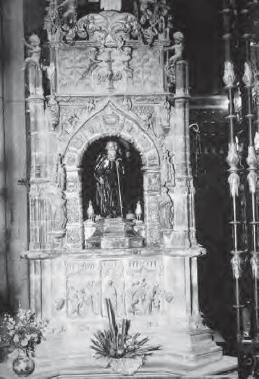 El Sepulcro de San Lesmes Riguroso contemporáneo de Santo Domingo de la Calzada es Adelelmo, mejor conocido como San Lesmes, natural de Loudun (Poitou), abad de la famosa abadía de la Chaise-Dieu, y venido a España a requerimientos posiblemente de la esposa de Alfonso VI, D.a Constanza. El rey lo colocó en 1091 al frente del monasterio de San Juan Bautista que había fundado a las puertas de la ciudad de Burgos, para la atención de su hospital anexo. A tal fin destinaría la capilla de San Juan Evangelista que había mandado edificar para sepultura de pobres y peregrinos. Su biógrafo Rodulfo le atribuye también la construcción de un puente y la desecación de lagunas[67]. A su muerte el 30 de enero de 1097 fue enterrado en la capilla de San Juan, atrayendo pronto los milagros efectuados en la tumba numerosos devotos. Afortunadamente conservamos su primitivo sepulcro, un sencillo sarcófago de piedra liso, sin ornamentación, con cubierta trapezoidal a doble vertiente, en suave pendiente, cuyos orígenes remontan en la Península a la tapa del sarcófago de Ithacio del siglo V, que tuvo una notable descendencia en los siglos XI y XII, a juzgar por el gran número de ejemplares, con o sin decoración, que reproducen su tipología y han llegado hasta nosotros, desde Asturias a Aragón[68]. No fue infrecuente en la Edad Media la utilización de este tipo de sepulcros, incluso entre la nobleza, como fue el caso del sarcófago romano reutilizado en el siglo X por el Conde de Castilla Fernán González para ser enterrado, en el monasterio de San Pedro de Arlanza completamente liso[69]. El tipo fue muy prodigado entre los primitivos sepulcros de santos, por razones obvias de humildad. Los santos han preferido para sí enterramientos modestos[70]. Aunque es muy posible que en el siglo XII se le hubiera elaborado un bello sepulcro artístico, como los de Santo Domingo o San Juan ya vistos, hoy no conservamos más que una efigie yacente del santo, perteneciente sin duda a otro sepulcro muy posterior que se labraría con ocasión del traslado de sus restos a la nueva iglesia de San Lesmes levantada en su honor en el siglo XV-XVI. Este yacente de San Lesmes que se venera actualmente en la nave central, a los pies del presbiterio de la iglesia, ha sido atribuido recientemente al Maestro de Cobarrubias y habría sido realizado a fines del siglo XV o principios del siglo XVI[71].