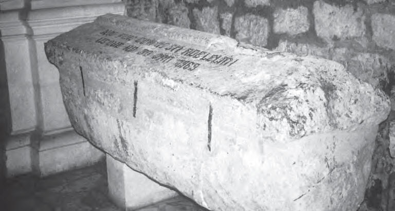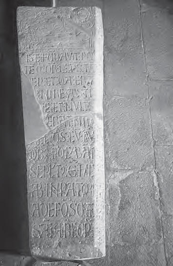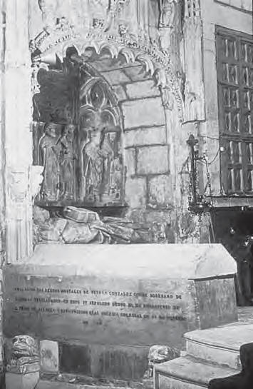 De la lápida se deduce que este Pedro fue arquitecto de San Isidoro de león y ponteador y que murió con fama de Santidad, por su vida de austeridad y sus muchos milagros habiendo sido enterrado ahí por disposición de Alfonso VII y la reina Sancha. Como ya observó el profesor S. Moralejo no debemos confundirlo con el Pedro Peregrino, a quien la guía del Codex Calixtinus rememora entre los viatores que repararon el Camino, entre Rabanal y la Ribera del Miño y quien reconstruyó el puente de Portomarin[72]. Los estudiosos de la arquitectura de la iglesia de San Isidoro han interpretado el «superedificavit» de la lápida funeraria alusiva a las bóvedas de la cubierta, que es lo que quedaría por terminar de la basílica antes de la consagración de 1149[73]. Su sepulcro representa la efigie del santo arquitecto grabada en la zona superior de la tapa mientras dos ángeles le inciensan, motivo en el que hemos de ver una clara alusión a su beatitud. Se realza de esta manera su muerte santa, tal como lo consideraron sus contemporáneos, si bien aún no ha sido canonizado por la Iglesia. En el chaflán del borde da comienzo el largo epitafio al que hemos aludido[74]. Sepulcros con la efigie del difunto grabada sobre la tapa las encontramos también en otras sepulturas románicas de la Colegiata, como la de su primer abad D. Menendo (h. 1167) a quien se le representa vestido con ornamentos pontificales, mitra y báculo. Todas ellas tienen su precedente en el cenotafio de García, último conde de Castilla, cuya cubierta reproduce la efigie grabada del conde, a quien se le representa vestido con el brial de mangas largas y talle ceñido, ballugas y calzas en los pies, la corona condal sobre la cabeza y una flor de lis en la mano izquierda. Junto a los pies, figura su nombre y en el frente del arca una inscripción hace alusión a las circunstancias de su muerte violenta[75]. Sabemos que el sepulcro de Pedro Deustamben estuvo situado en el ángulo suroccidental de la iglesia basilical. Este hecho, poco frecuente todavía en el siglo XII, encuentra plena justificación, en la fama de Santidad que gozó el arquitecto ya en vida[76]. Aunque la iglesia no permitió durante la Alta Edad Media los enterramientos en el interior de «las basílicas de los santos», según la conocida disposición del Concilio Bracarense I, constituía una excepción a esta regla aquellos que había llevado una vida santa, lo cual sería recogido posteriormente, ya en pleno siglo XIII por la legislación civil, en las Partidas. Éstas, como es sabido, reconocieron el derecho a ser enterrados en el interior de las iglesias a determinadas personas, «Reyes y las reynas et sus fijos, et los obispos, et los abades, et los priores, et los Maestres, et los comendadores que son perlados de las órdenes et de las eglesias conventuales, et los ricos homes, et los otros hombres honrados que ficiesen eglesias de nuevo ó monesterios, et escogesen en ellas sus sepolturas; et de todo otro home quier sea clérigo o lego que lo meresciese por santidat de buena vida et de buenas obras...» (Partida Primera, título XIII, ley XI)[77]. La legislación eclesiástica, no obstante, mantuvo este espíritu desde los primeros siglos, dado el culto y la veneración que siempre ha tenido a los santos. Por otra parte, no deja de ser significativo el hecho de que haya sido Alfonso VII uno de los soberanos que promovió en su reino, al menos de deseo, los enterramientos en el interior de las Iglesias. Así lo pretendió para los reyes por ejemplo en el monasterio de San Salvador de Oña en 1137 demandando de los responsables el traslado de los monarcas desde el exterior al interior de la iglesia. Y él mismo sería enterrado en una capilla de la Catedral de Toledo, la vieja mezquita convertida en templo cristiano, cuando murió en 1157[78].